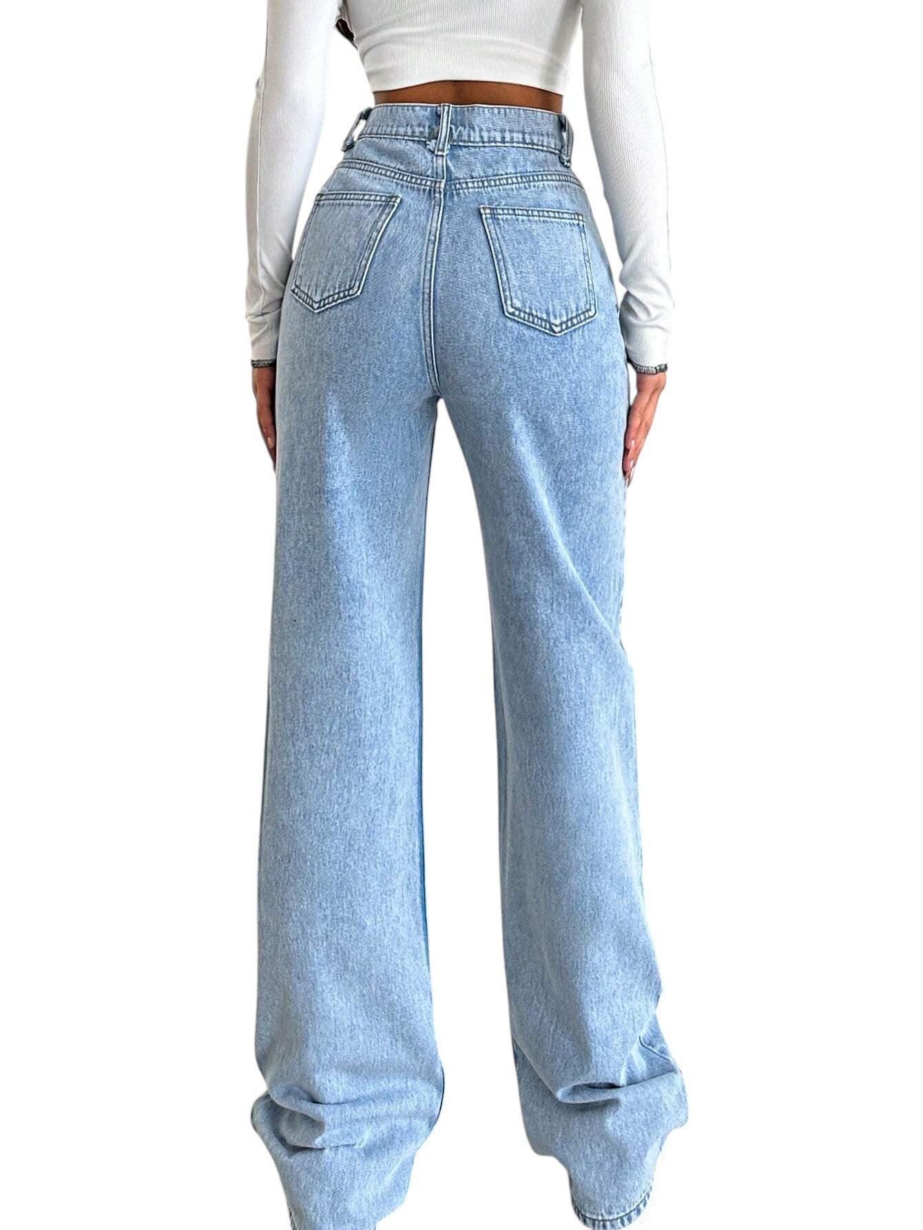 Címke nélküli, világoskék, magas derekú bő szárú farmer nadrág, gombos és cipzáras záródással, elöl és hátul zsebekkel.