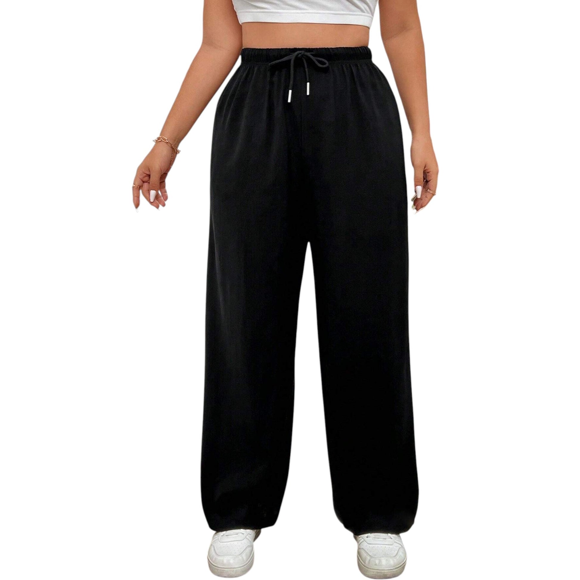 Címke nélküli, fekete, gumis derekú szabadidő nadrág megkötővel, bő szárral, laza szabással.