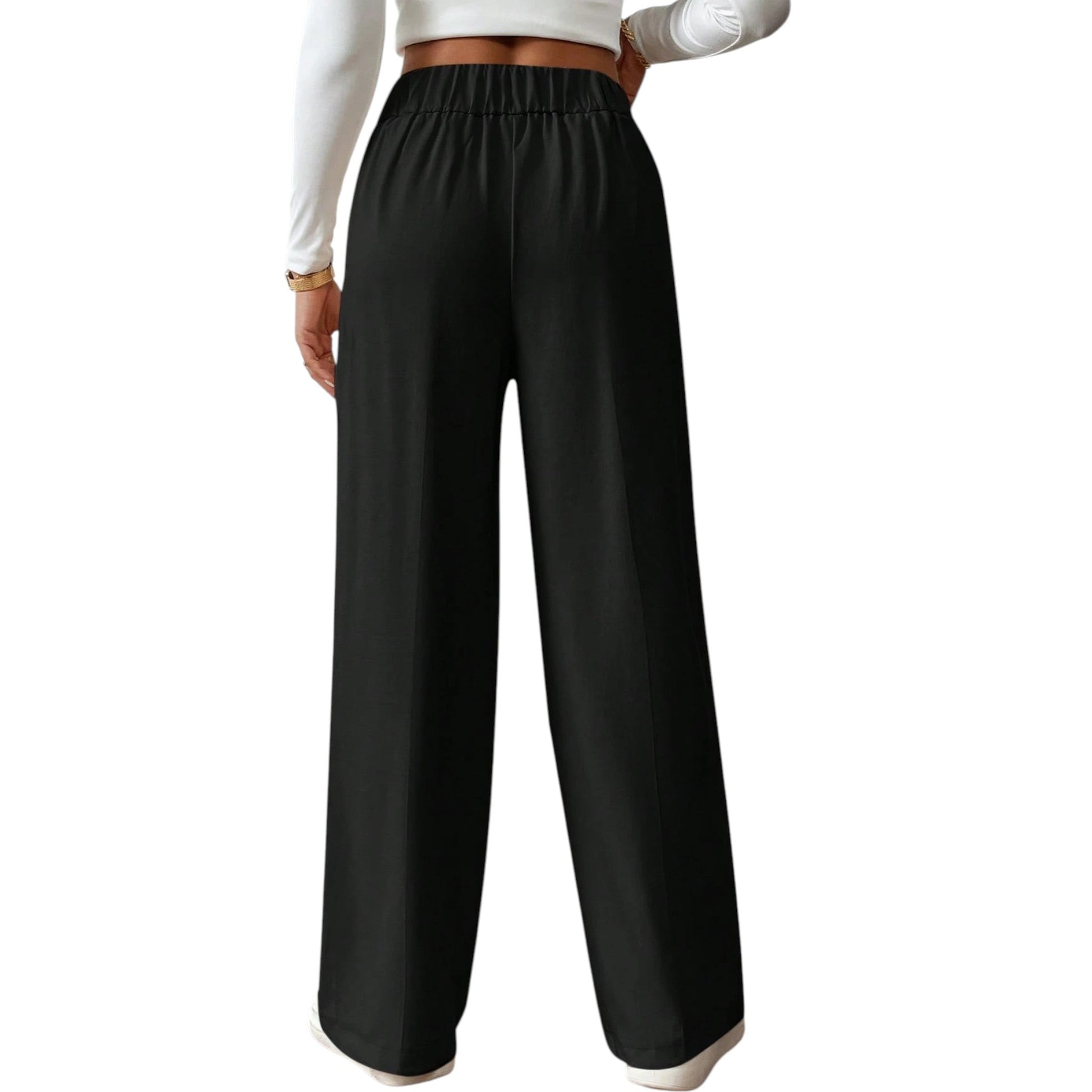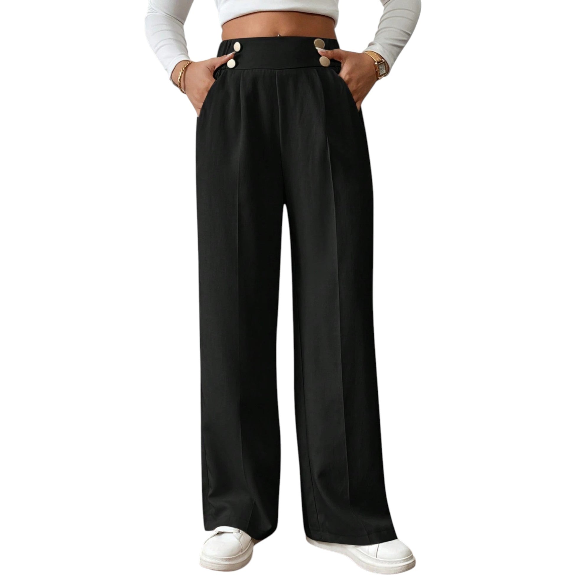 Címke nélküli, fekete, magas derekú, pliszírozott bő szárú nadrág, arany színű díszgombokkal a derékrészen, oldalsó zsebekkel.