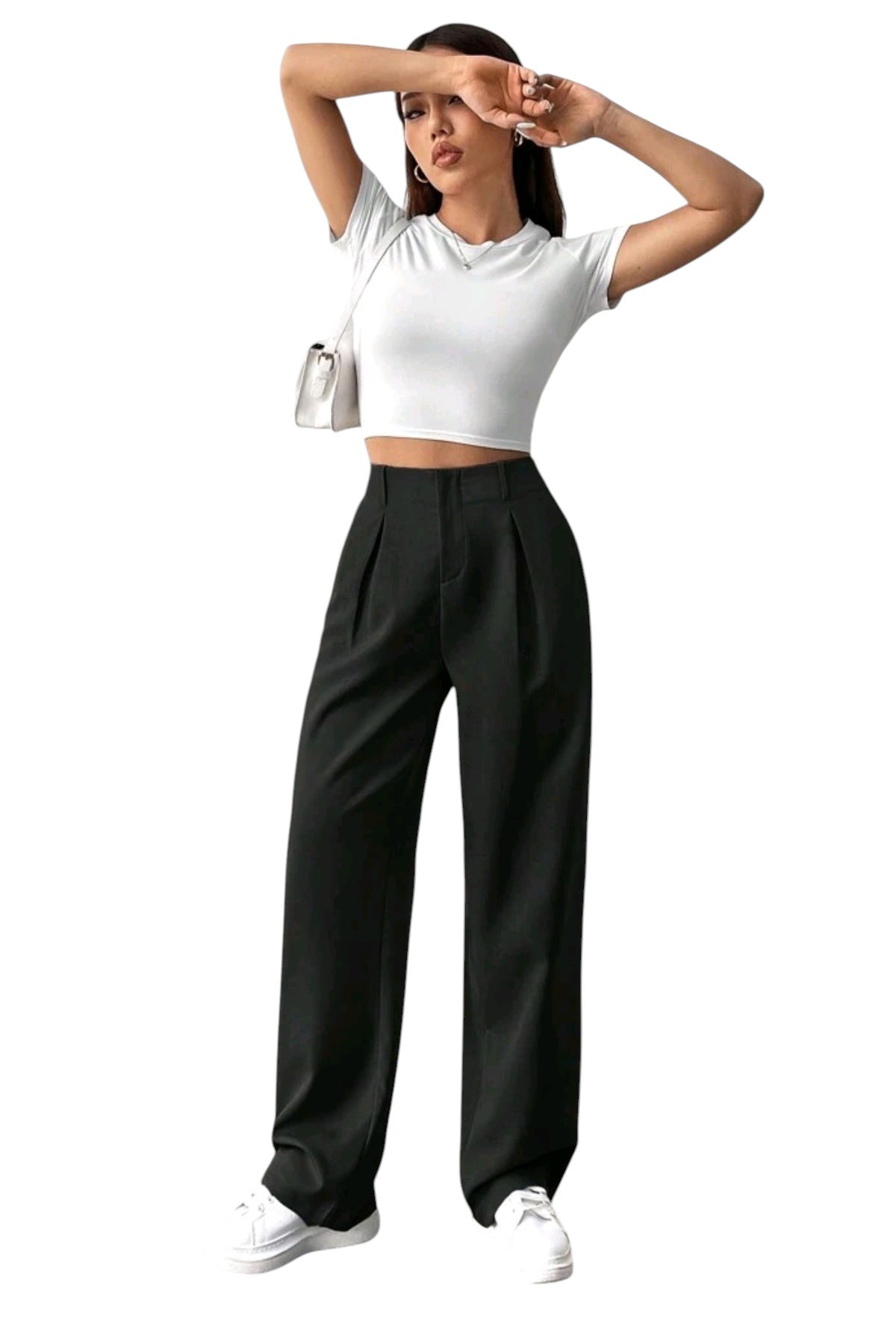 Címke nélküli, fekete, pliszírozott, magas derekú, széles szárú
