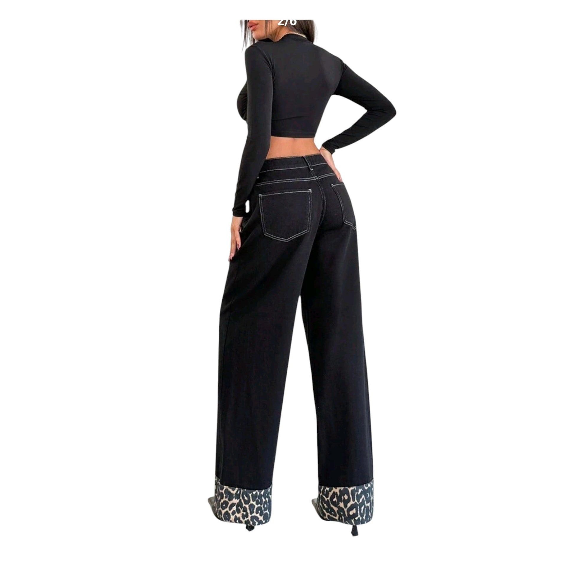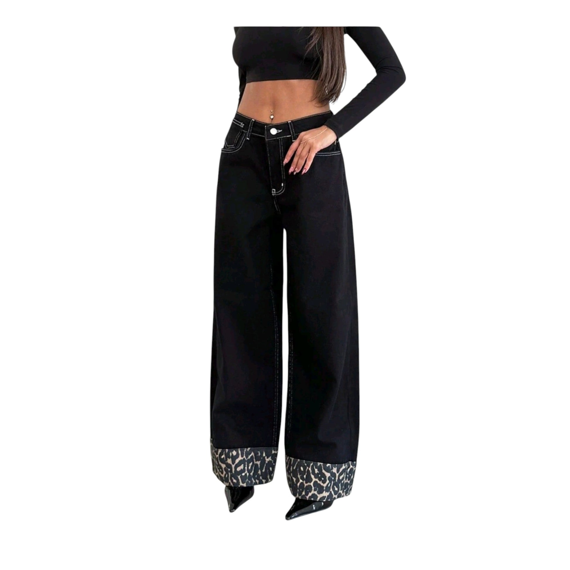 Címke nélküli, fekete, leopárd mintás szegéllyel, magas derekú.