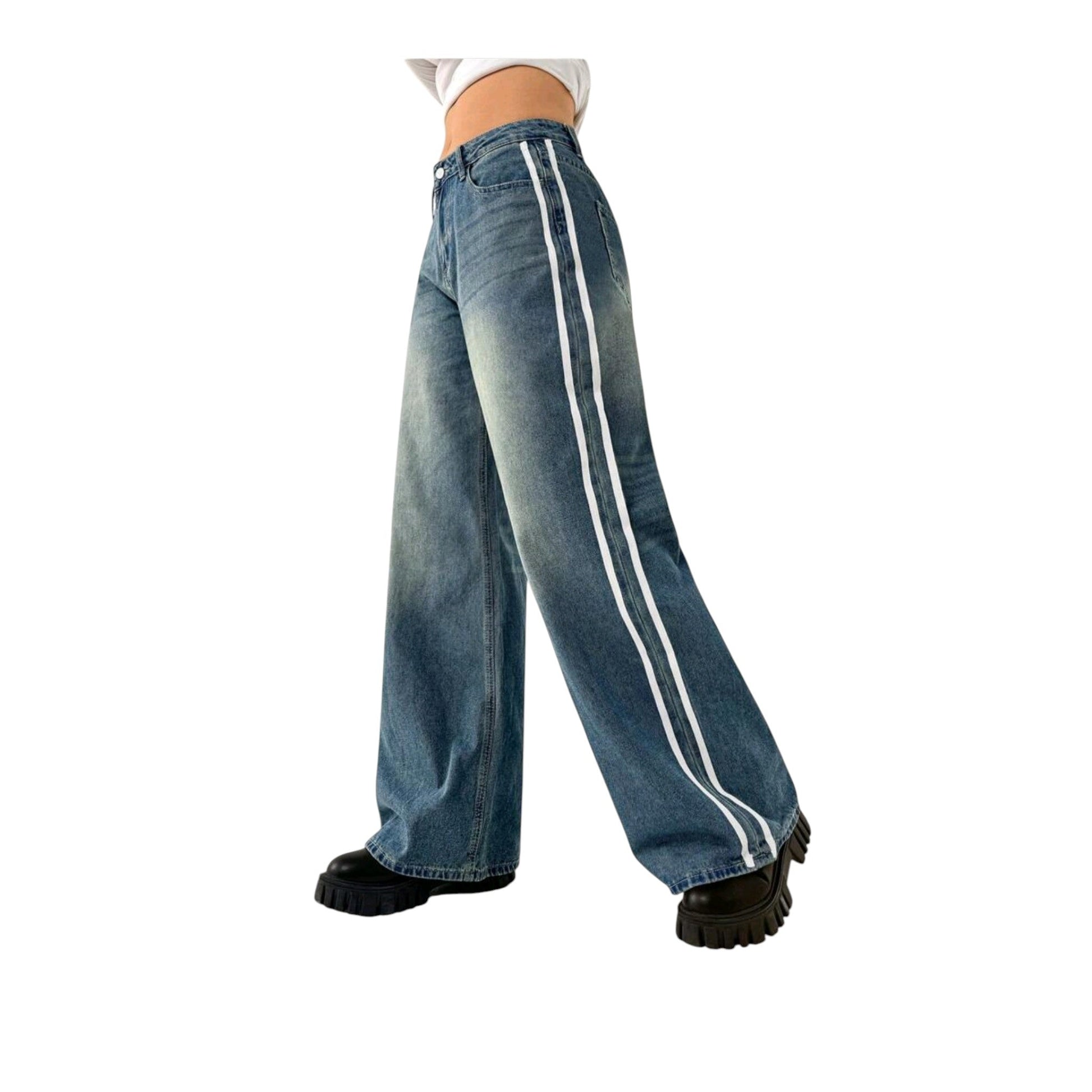 Címke nélküli, kék, oldalt fehér csíkokkal, magas derekú, sötét mosással.