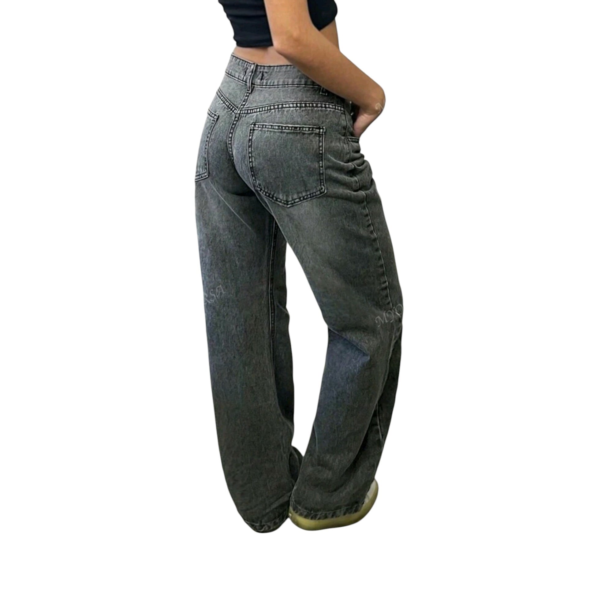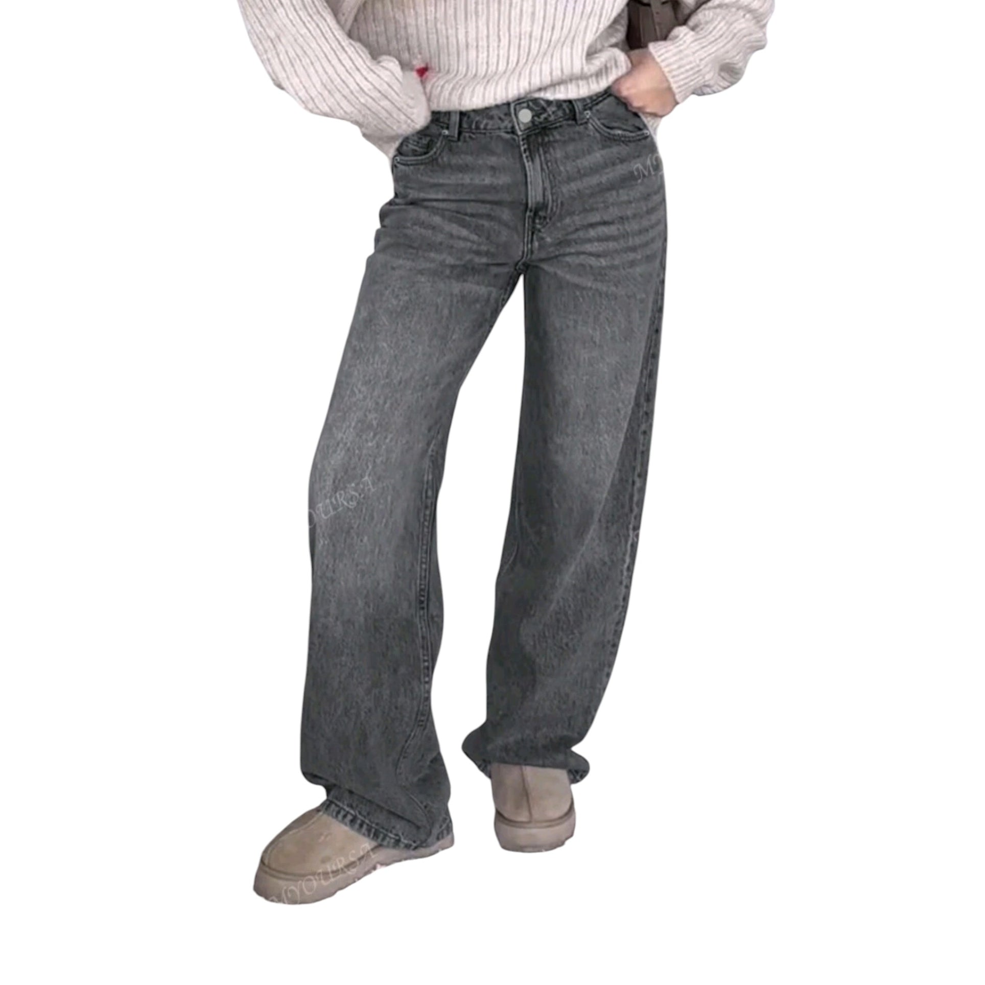 Címke nélküli, szürke, magas derekú, koptatott hatású, egyenes szárú farmer.