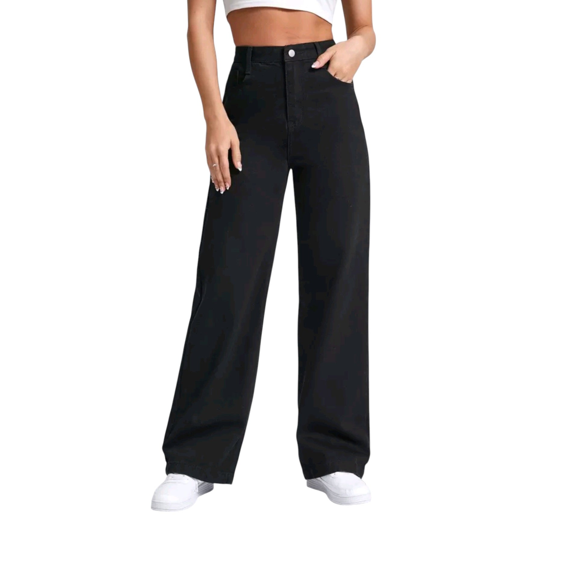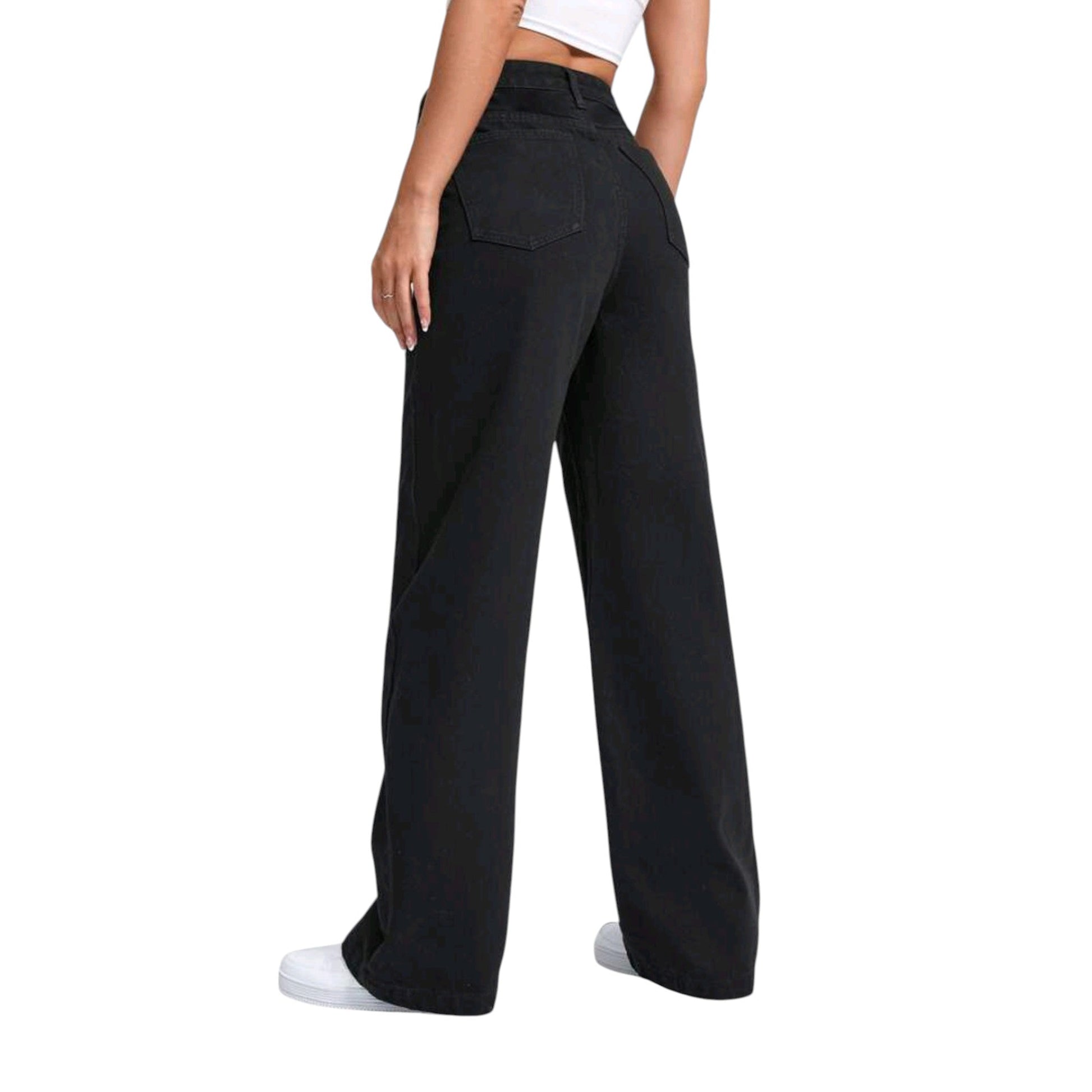 Címke nélküli, fekete, magas derekú, egyenes szárú farmer.