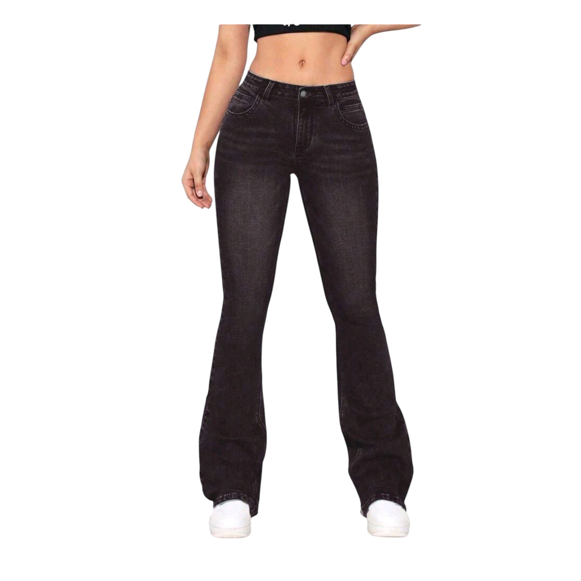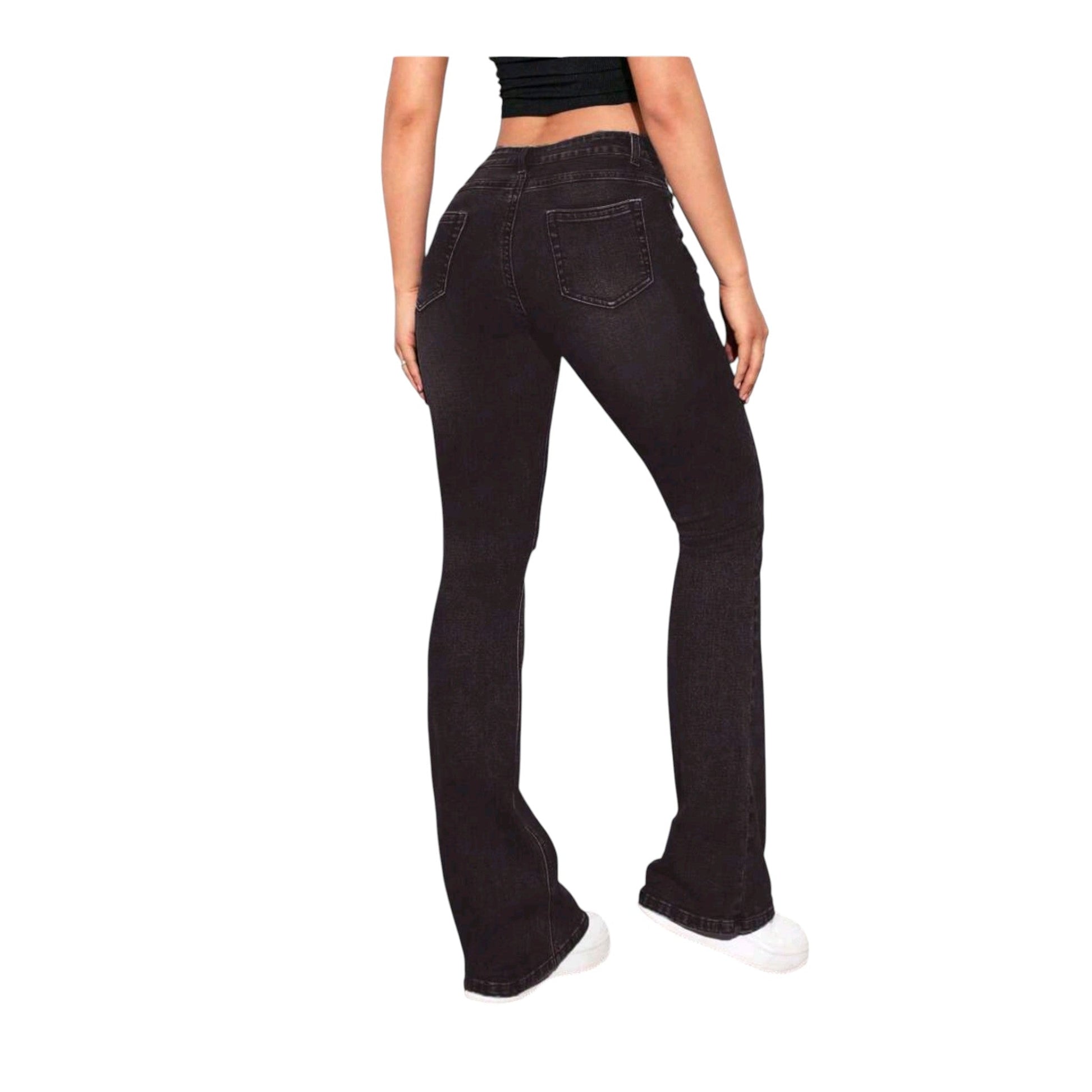 Címke nélküli, fekete, magas derekú, trapéz szárú farmer.