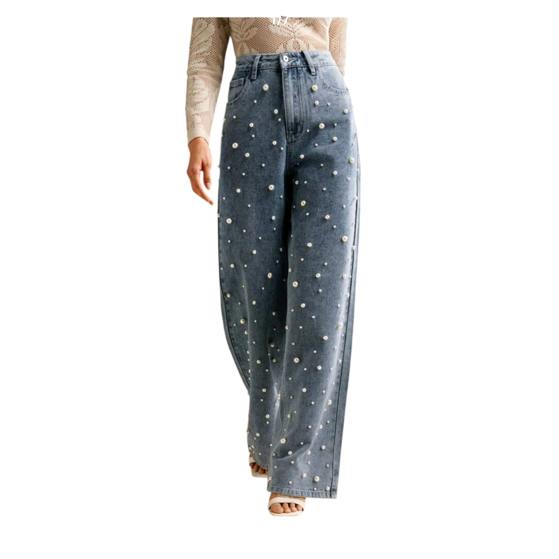 Címke nélküli, kék, gyöngyökkel díszített, magas derekú, egyenes szárú farmer.