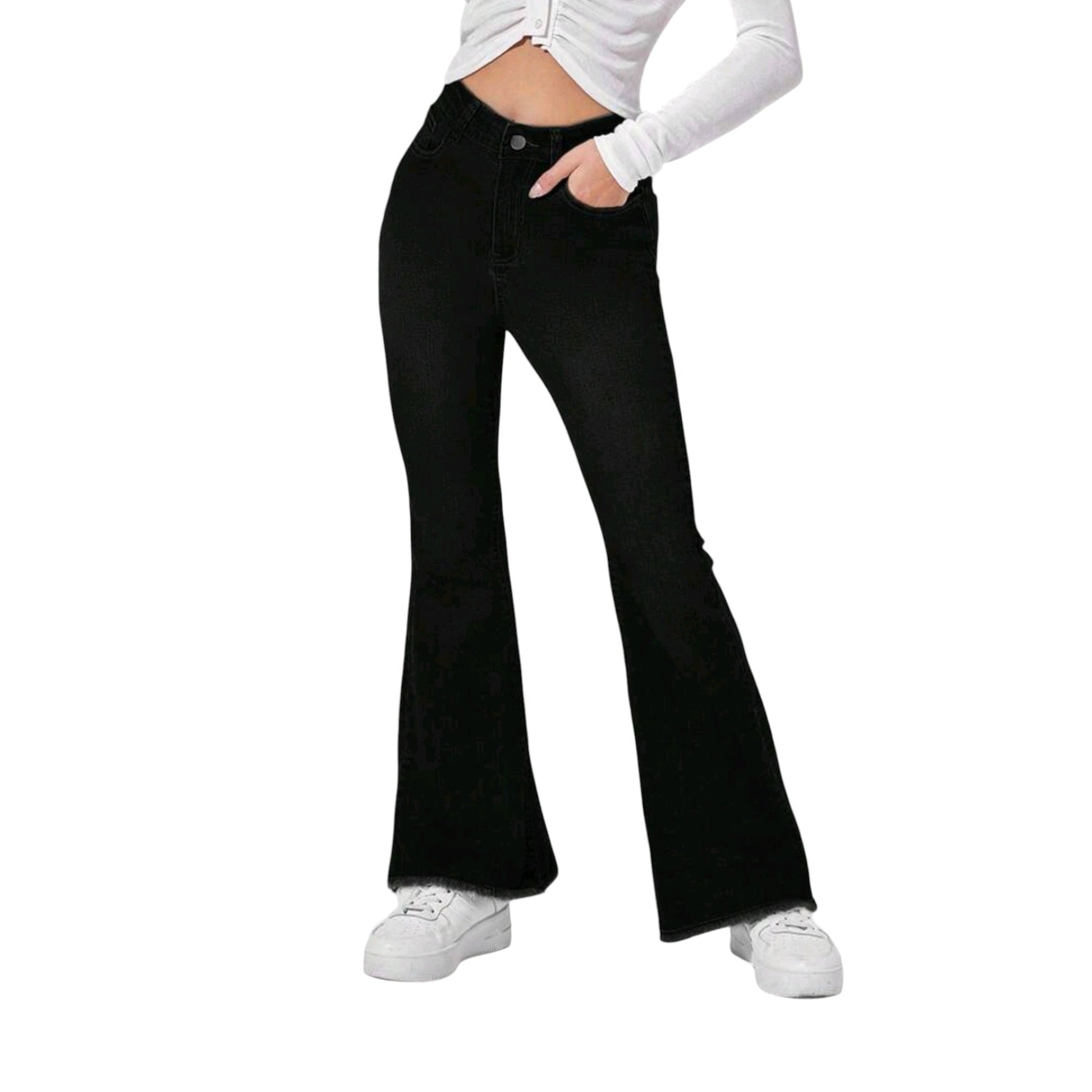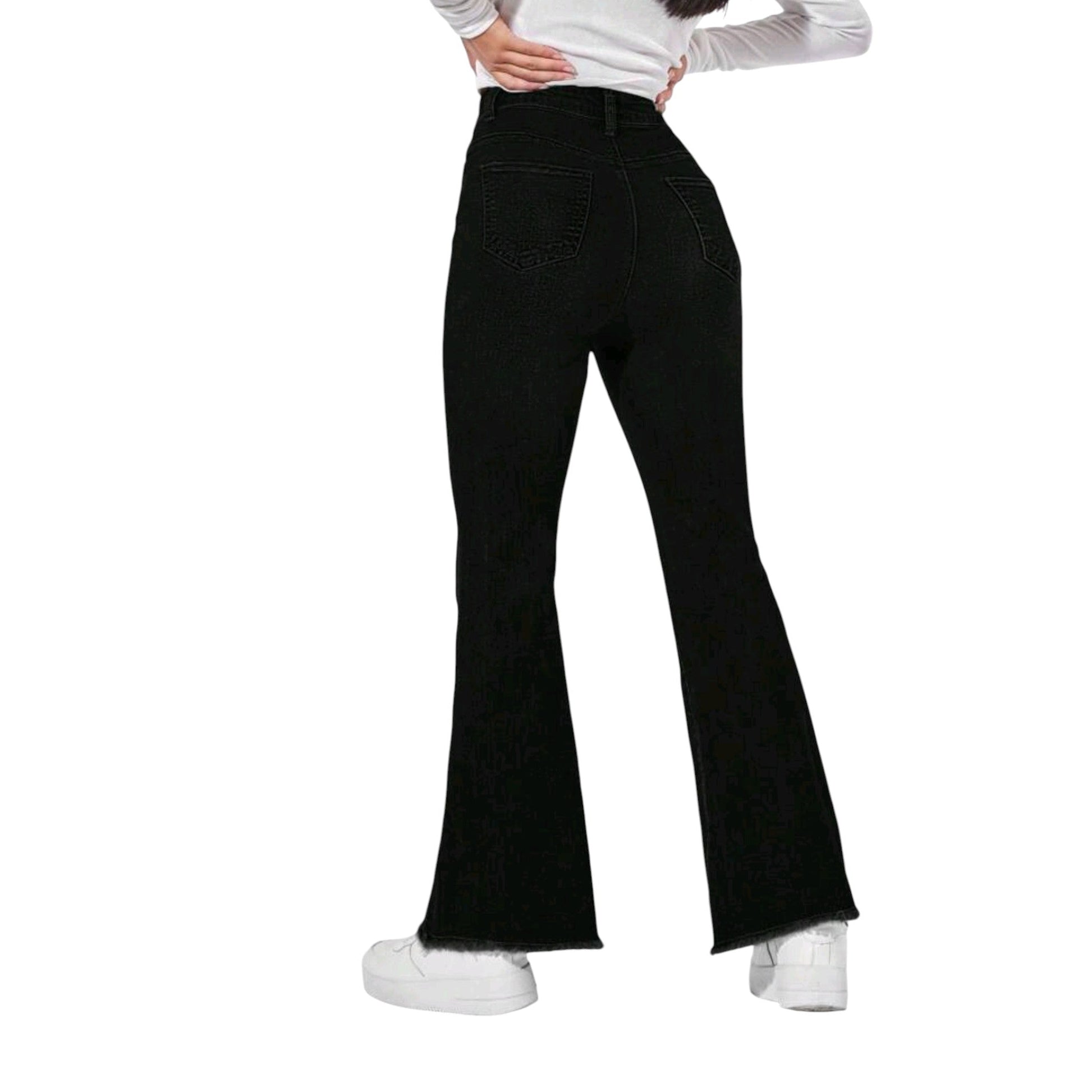 Címke nélküli, fekete, magas derekú, trapéz szárú farmer.