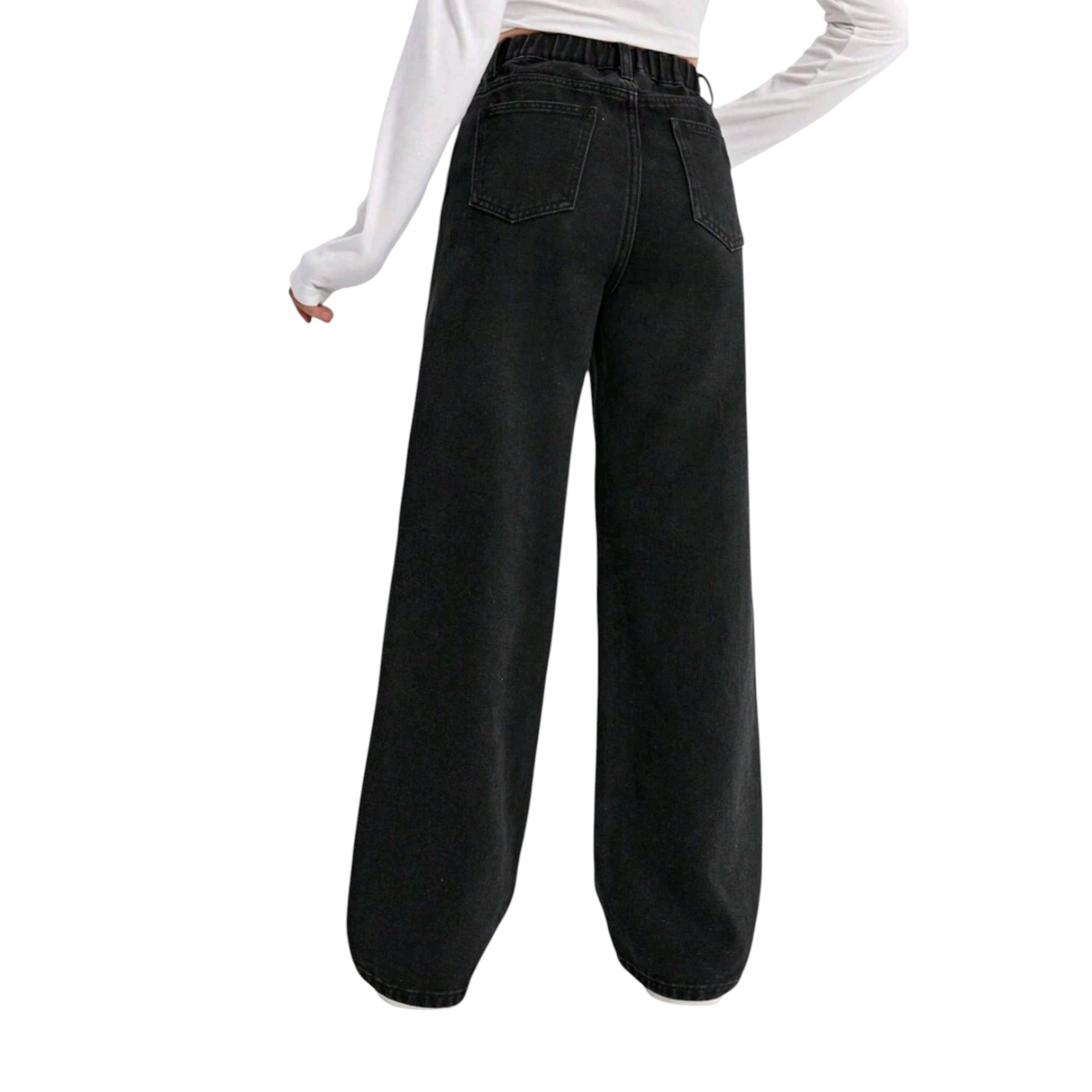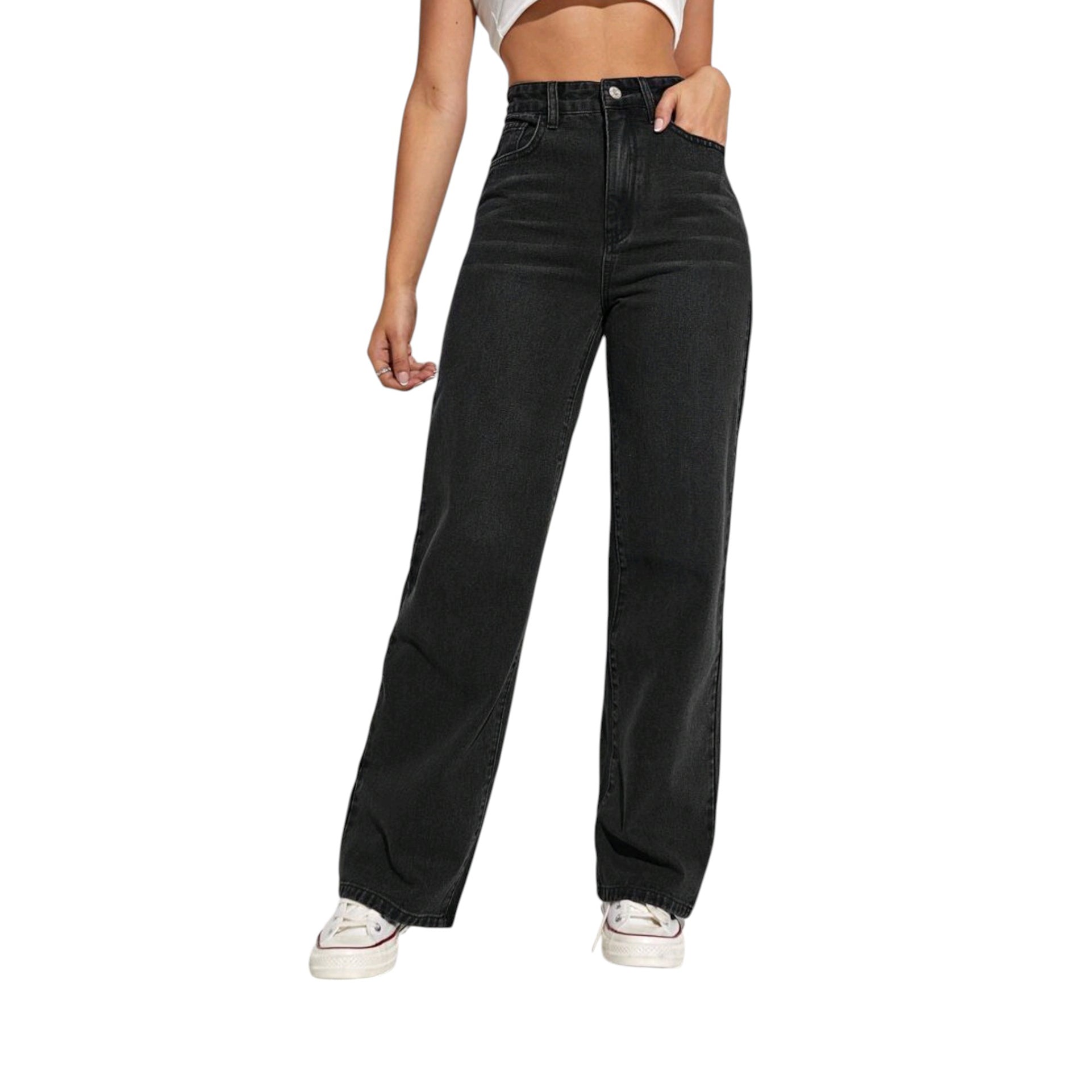 Címke nélküli, fekete, magas derekú, egyenes szárú farmer.