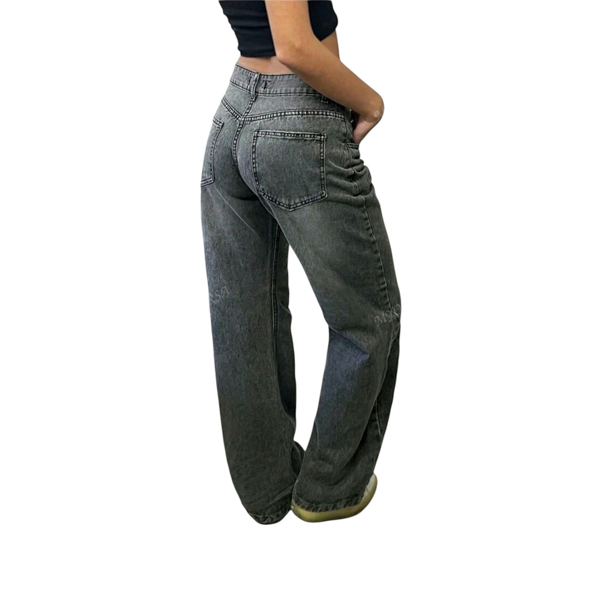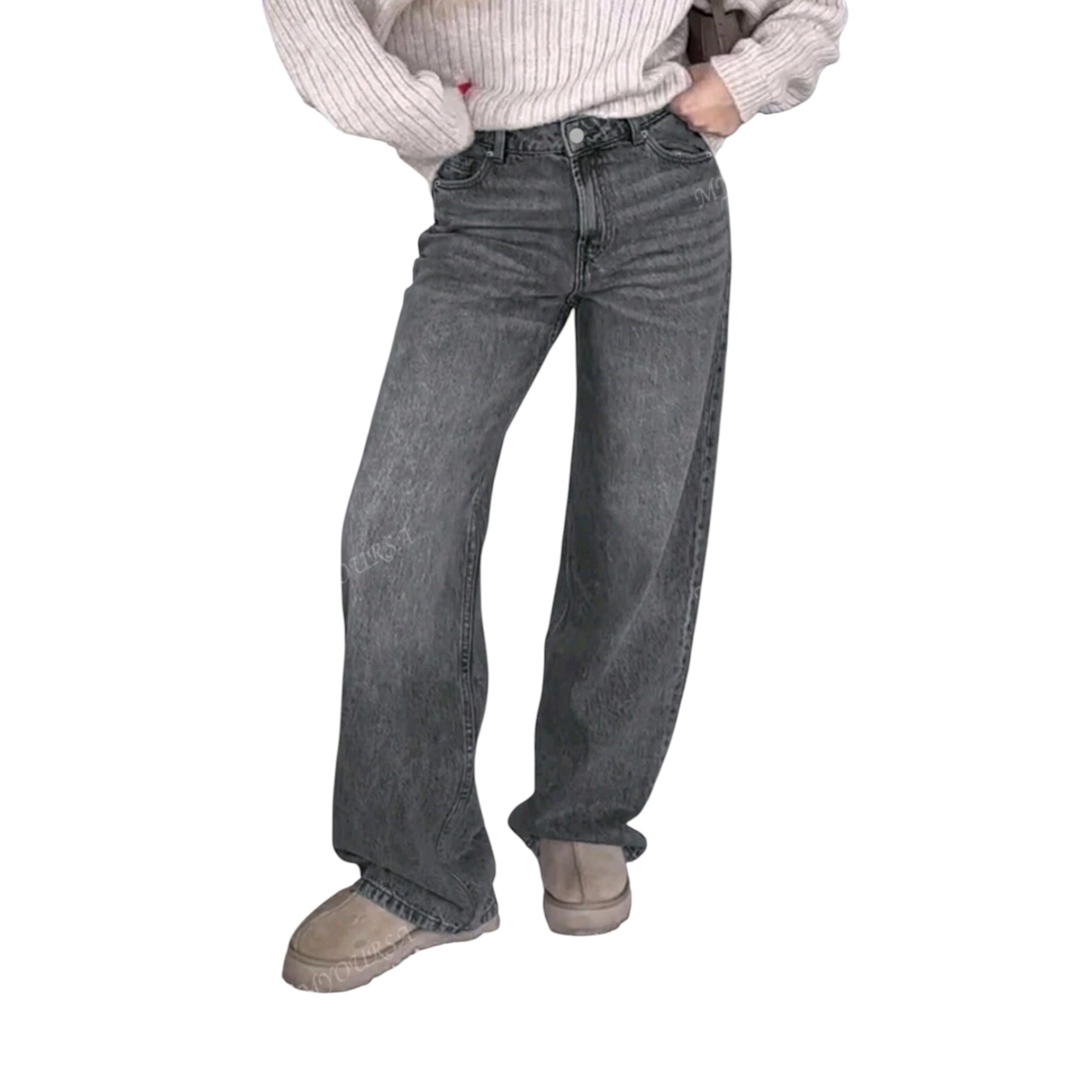 Címke nélküli, szürke, magas derekú, bő szárú, koptatott hatású farmer.