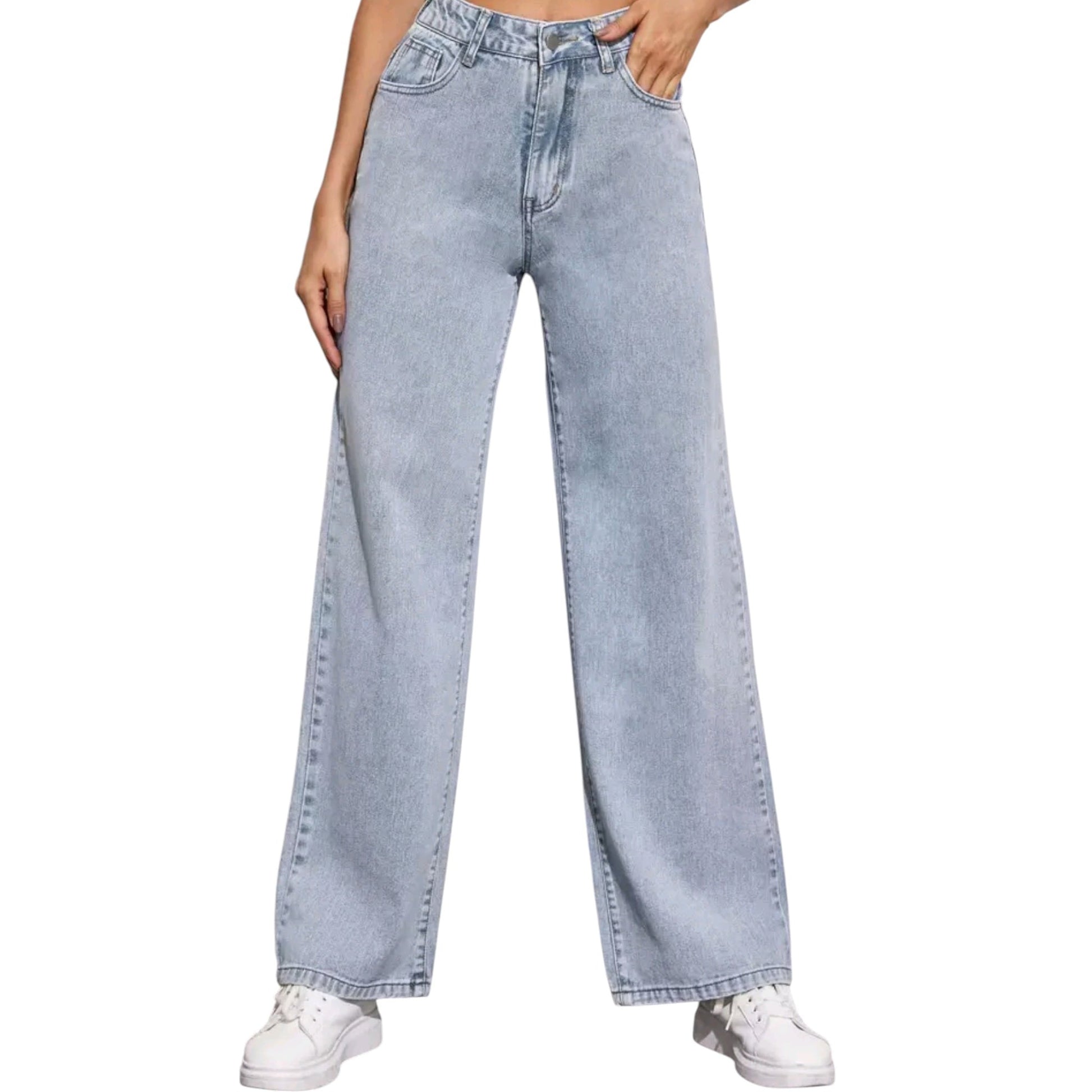 Címke nélküli, világoskék, magas derekú, wide leg fazonú, farmer anyagú.