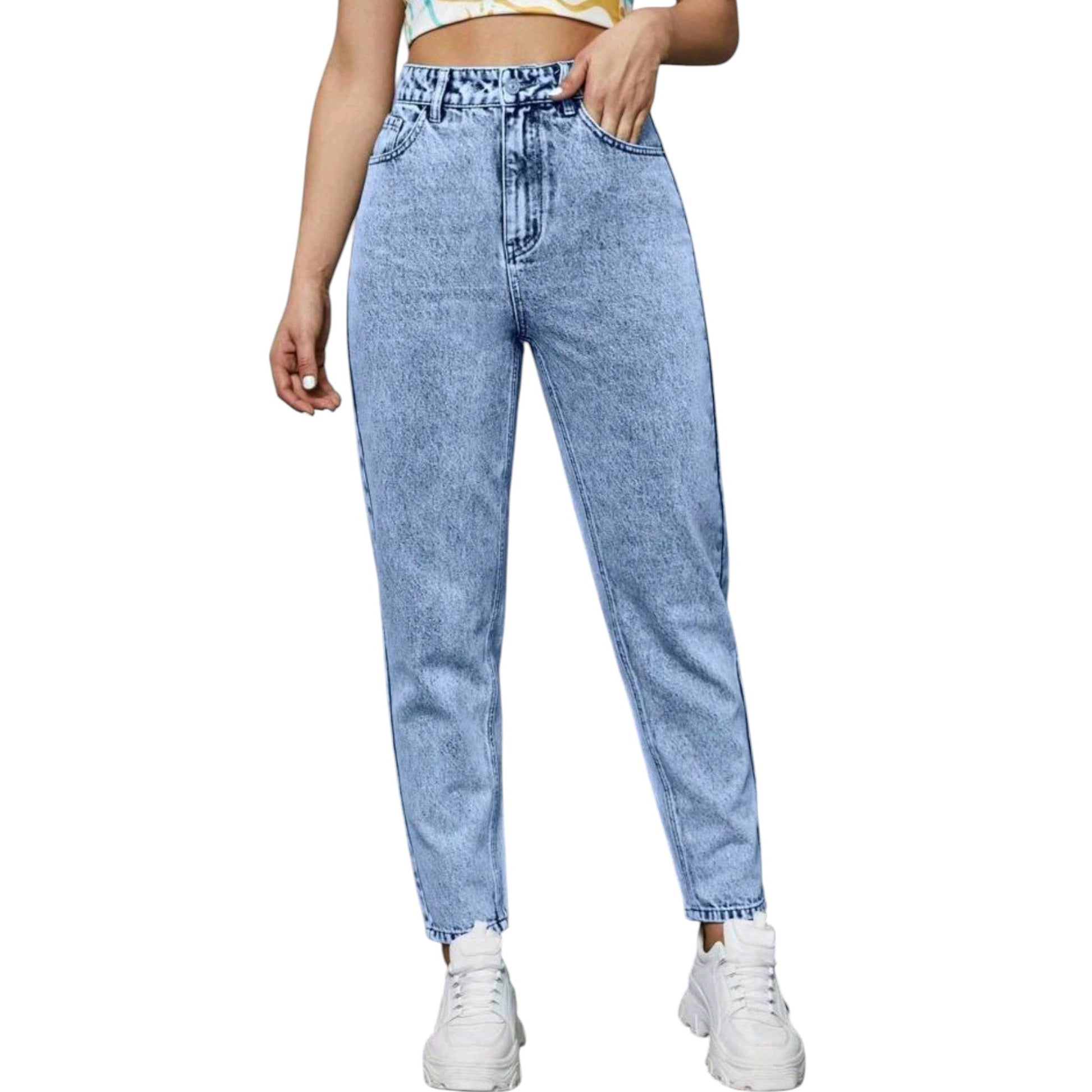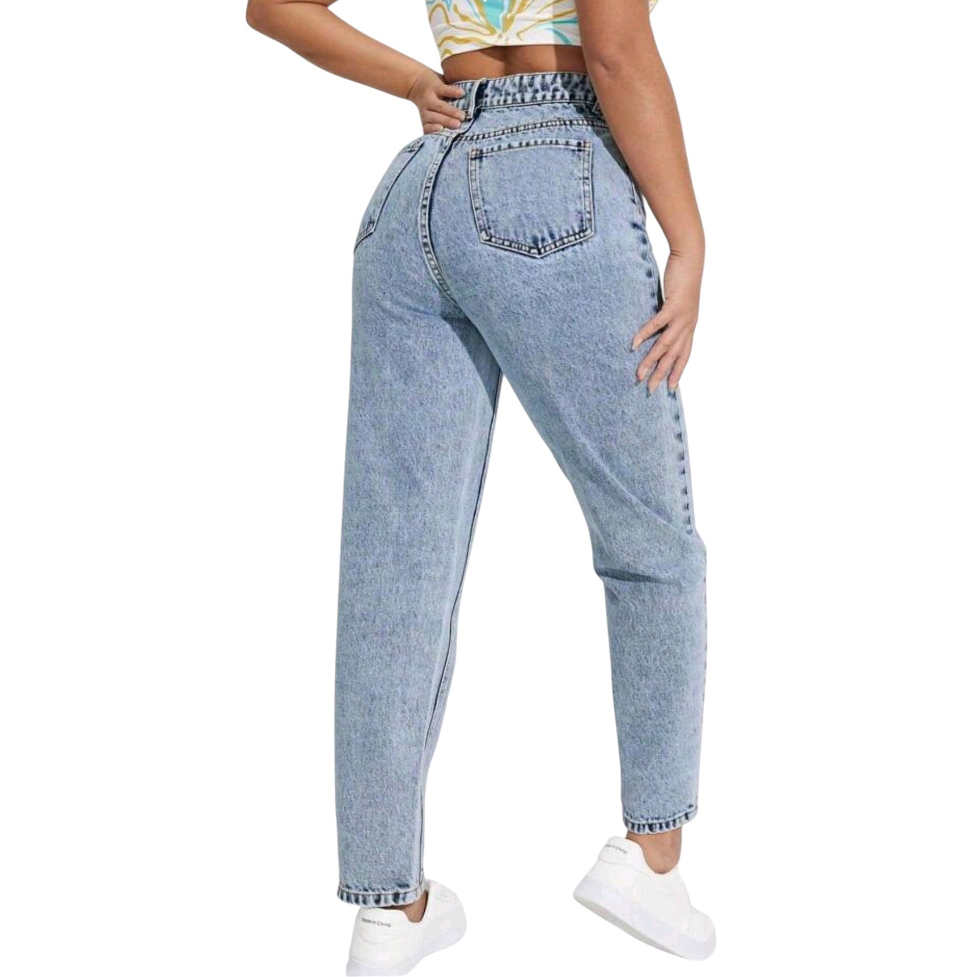 Címke nélküli, világoskék, magas derekú, mom fit fazonú, farmer anyagú.