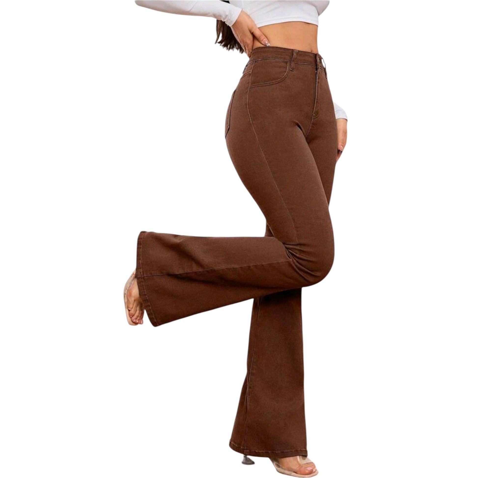 Címke nélküli, barna, magas derekú, trapéz szárú farmer nadrág, zsebes.