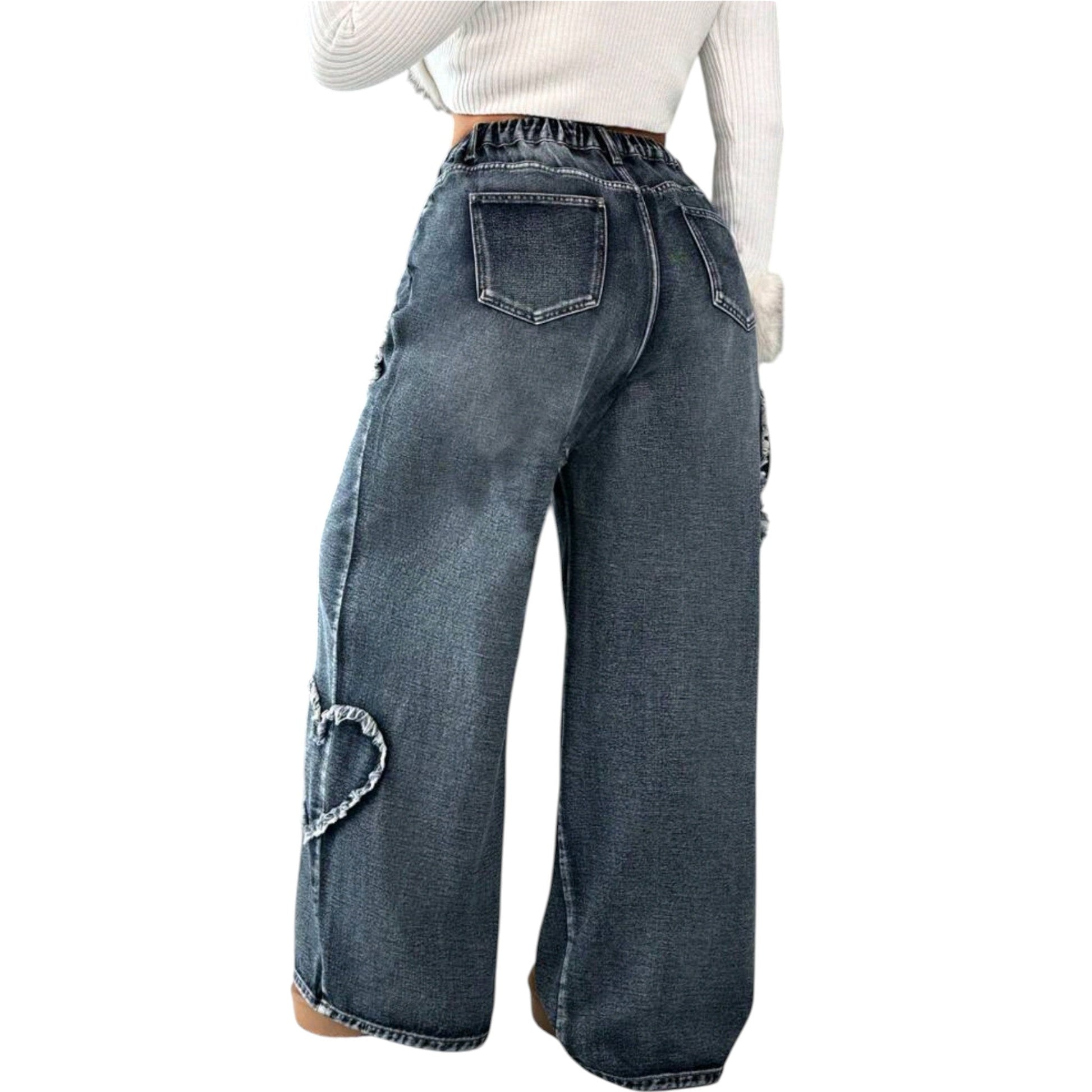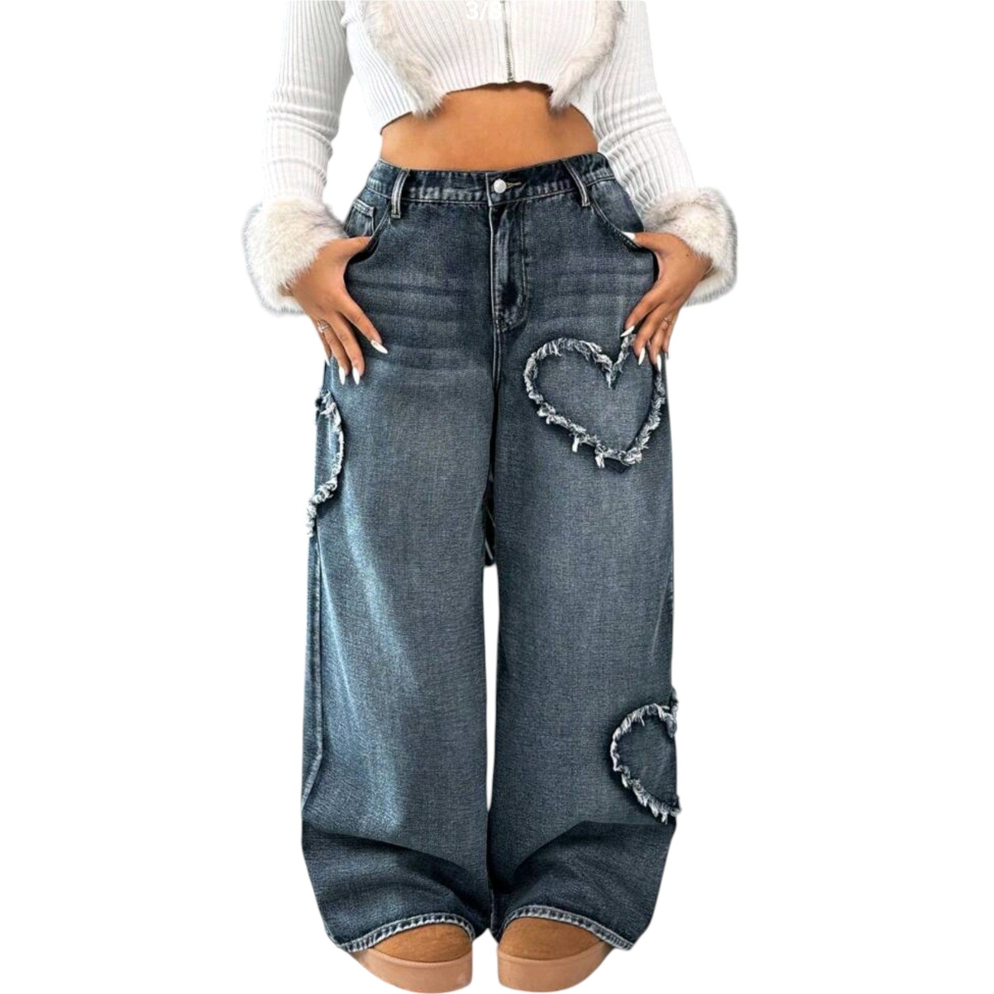 Címke nélküli, sötétkék, szaggatott, szív kivágással, boyfriend fazon, magasított derék, széles szárú