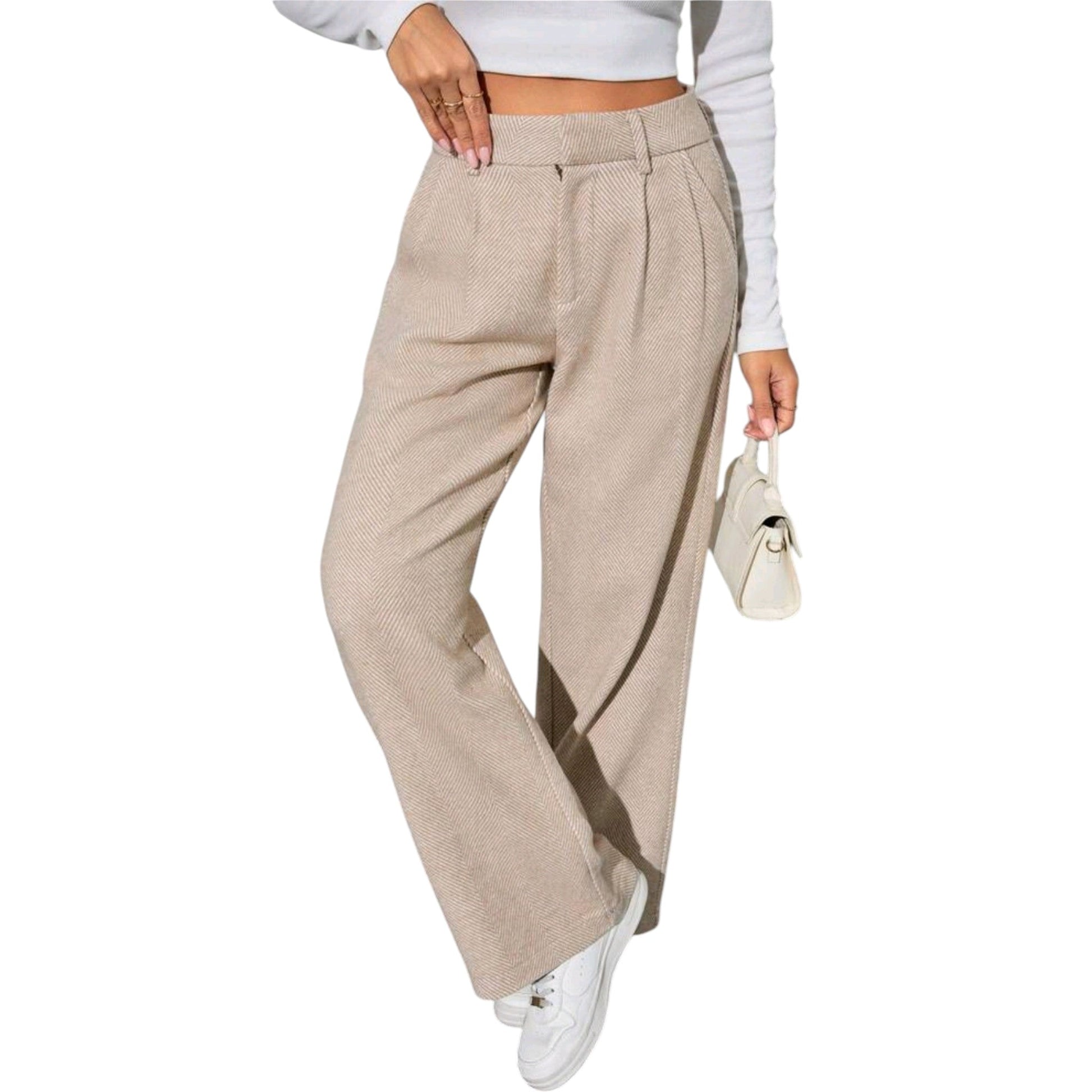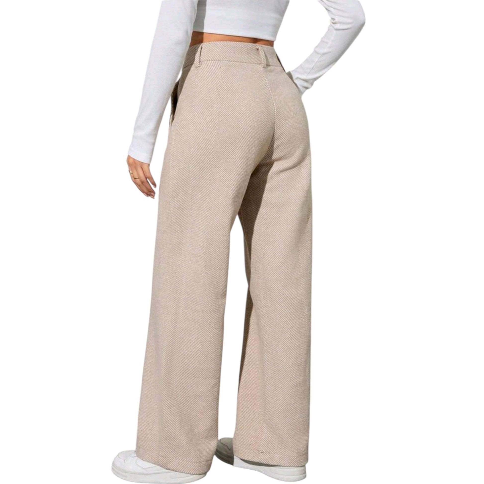Címke nélküli, bézs, wide leg, magasított derék, halszálka mintás