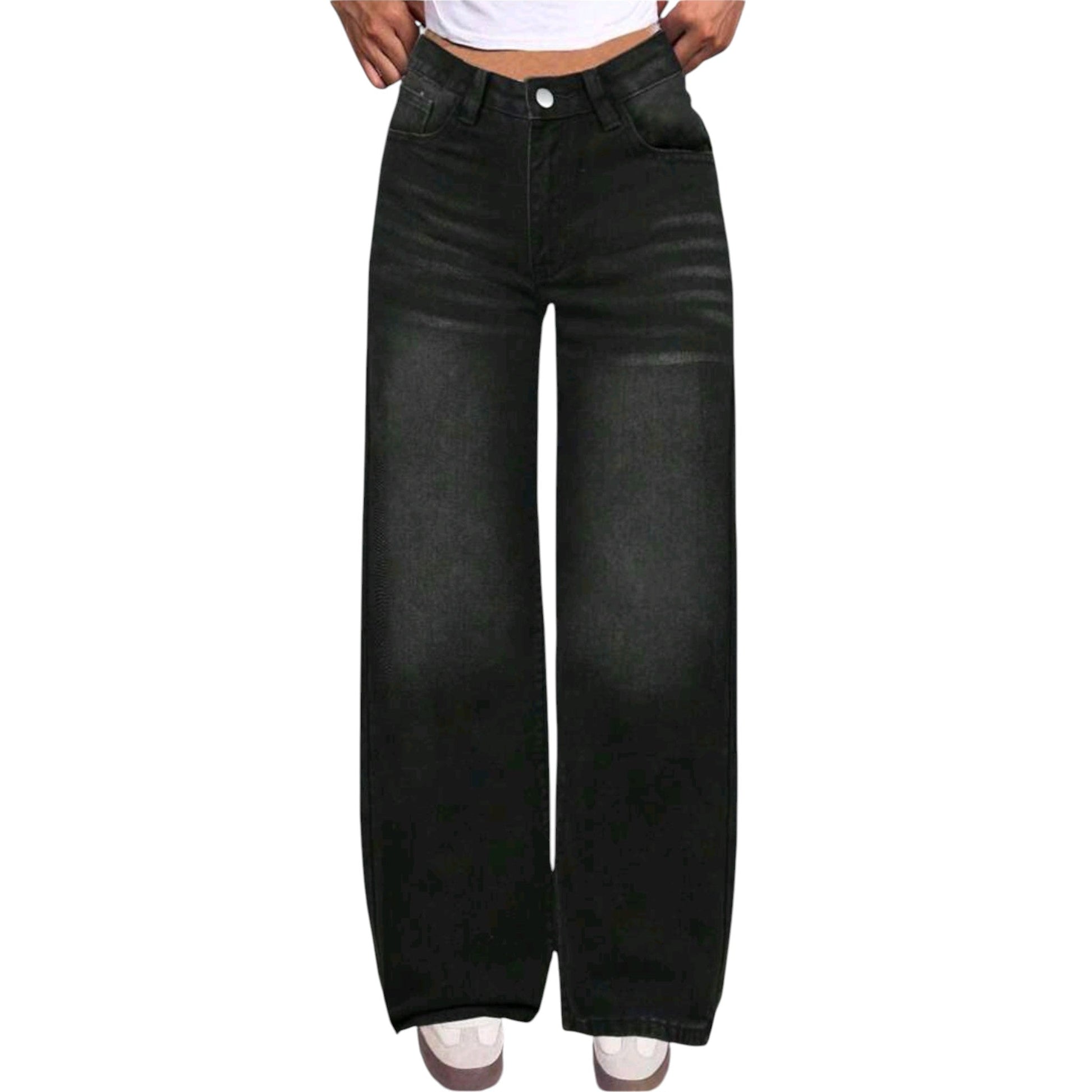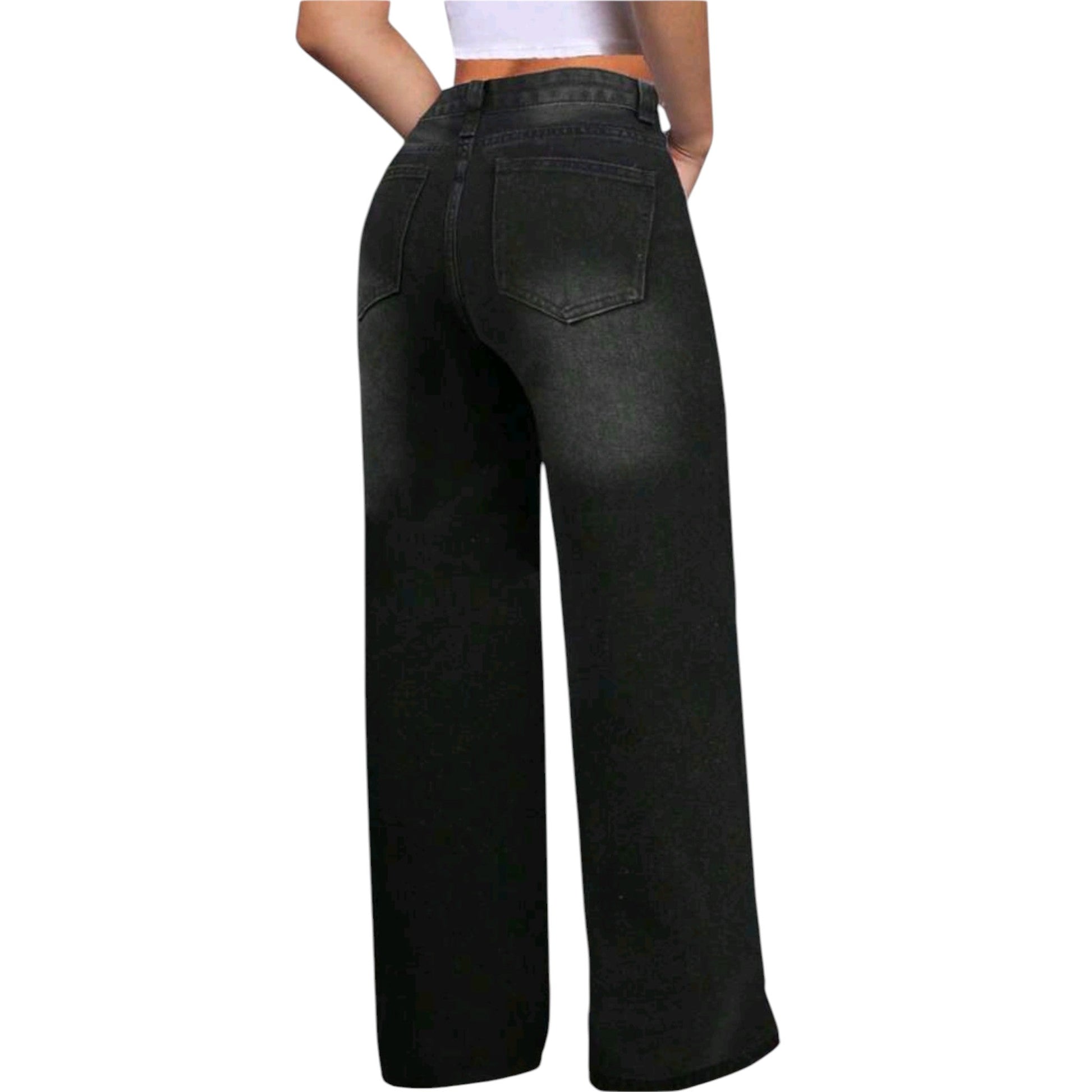 Címke nélküli, fekete, wide leg, magasított derék, koptatott hatású