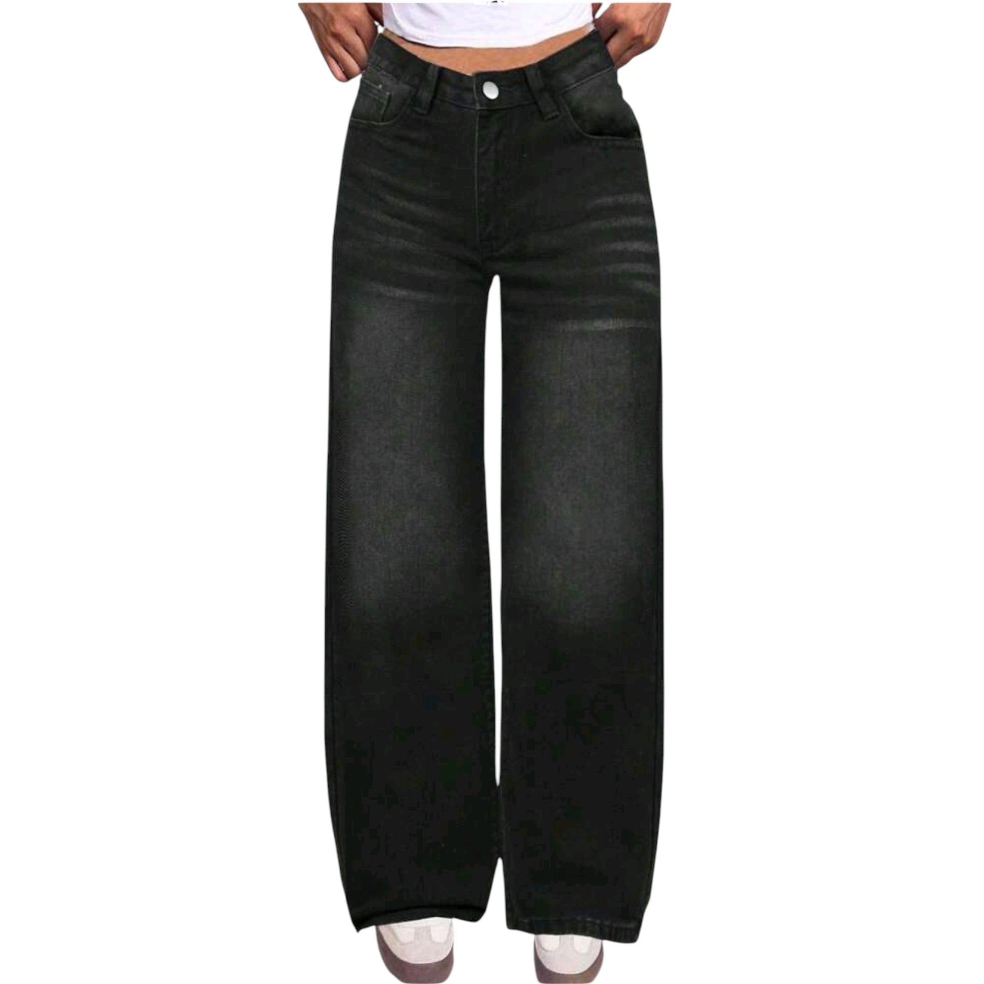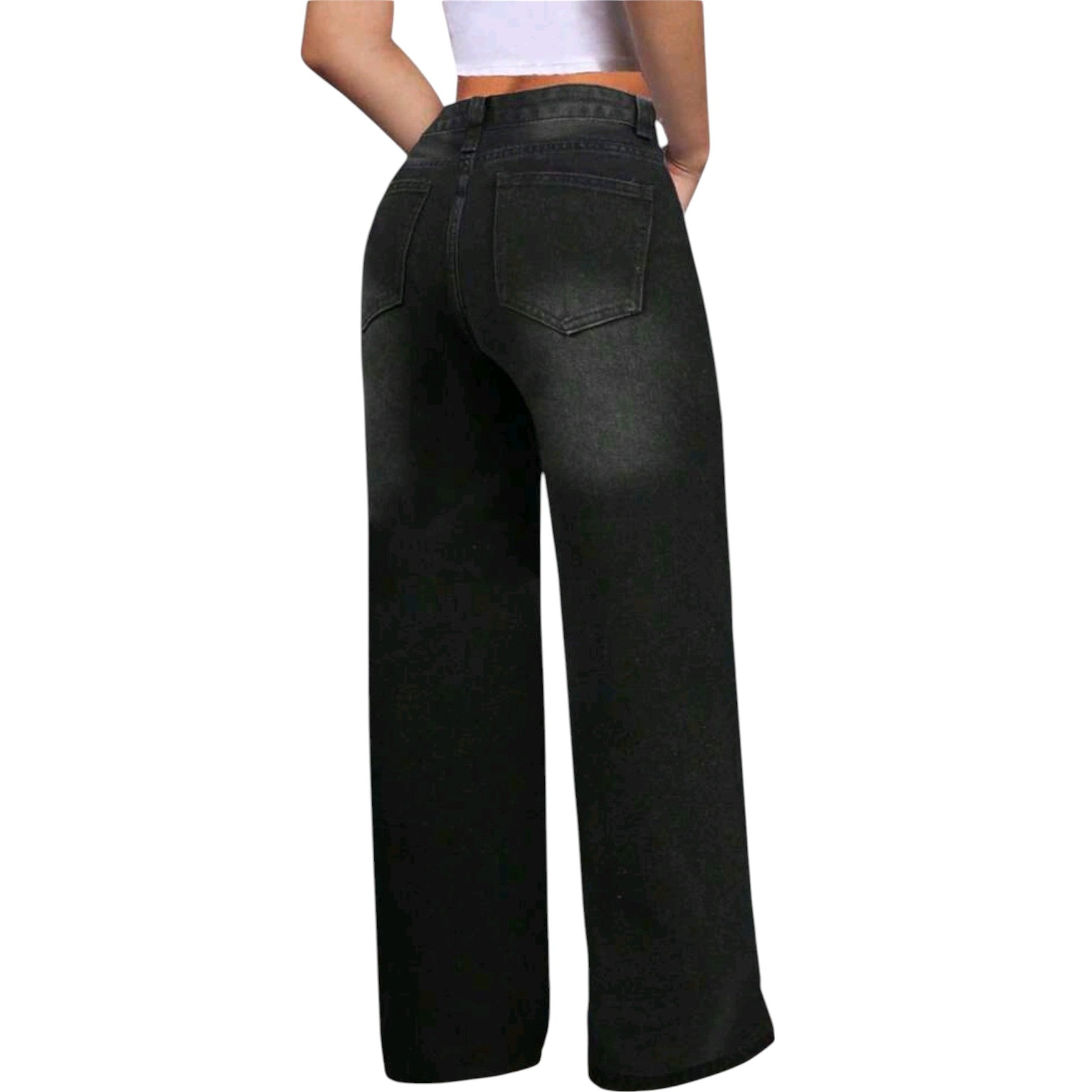 Címke nélküli, fekete, magas derekú, koptatott hatású, bő szárú farmer.