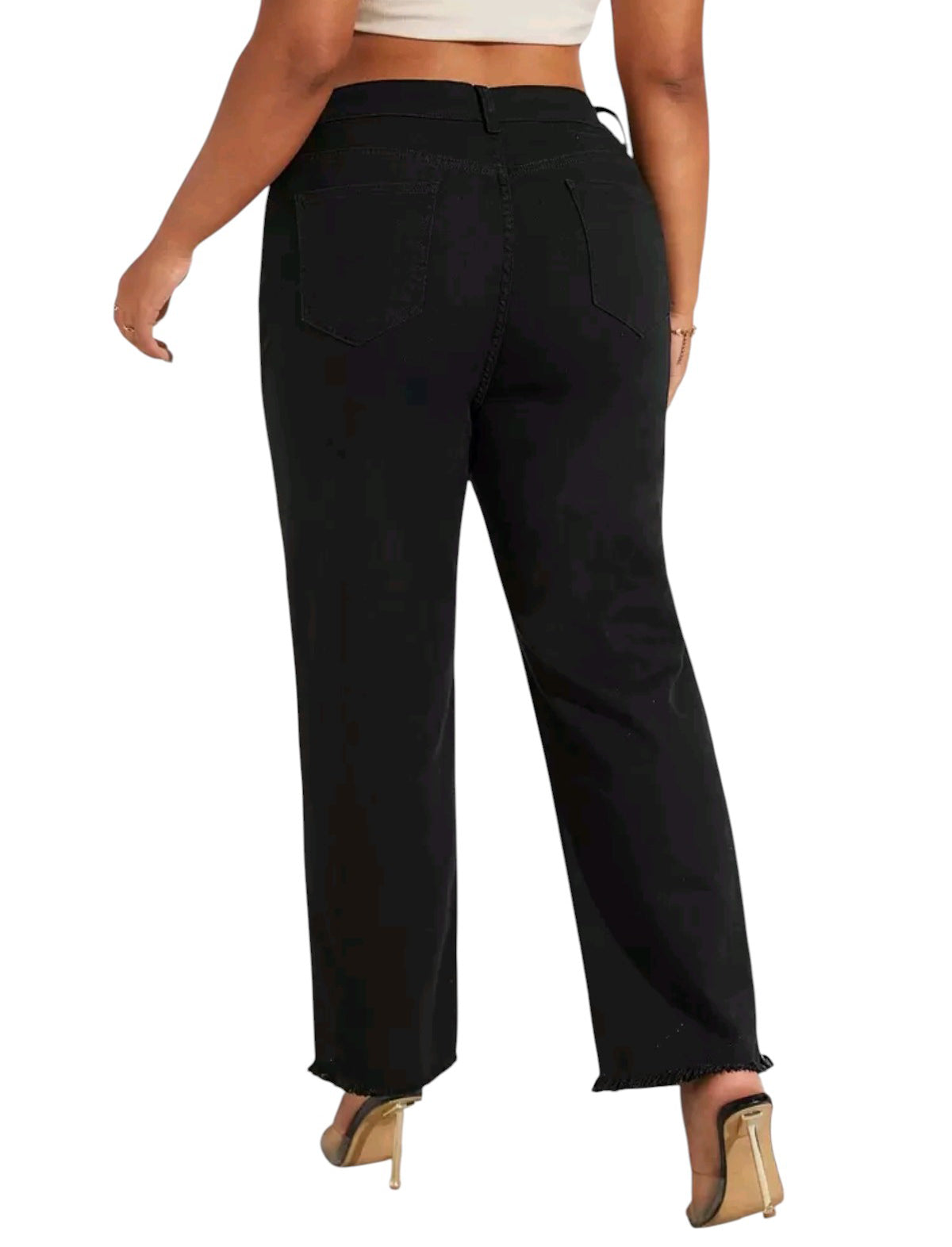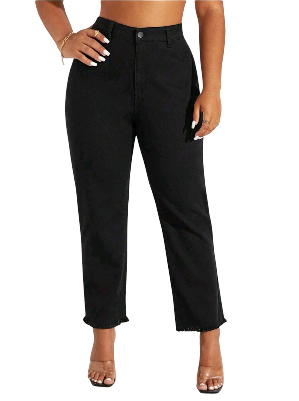 Címke nélküli, fekete, magas derekú, rojtos szárvéggel, egyenes szárú farmer