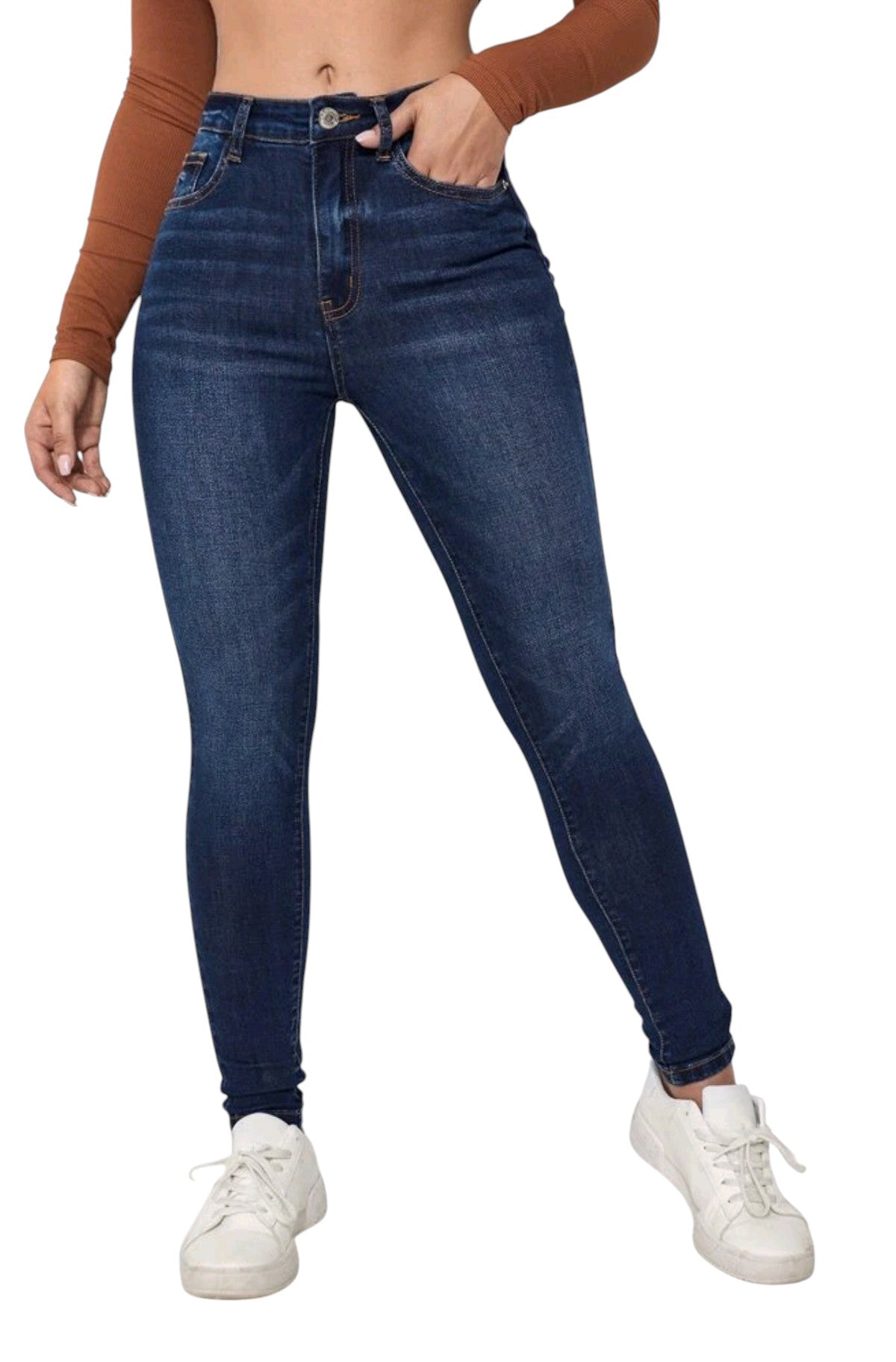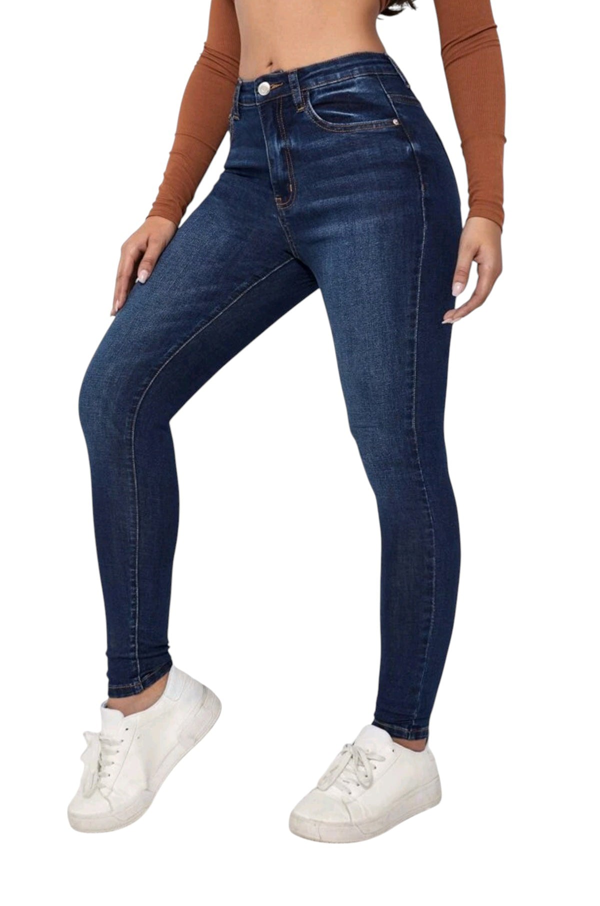 Címke nélküli, sötétkék, magas derekú, szűk szárú farmer