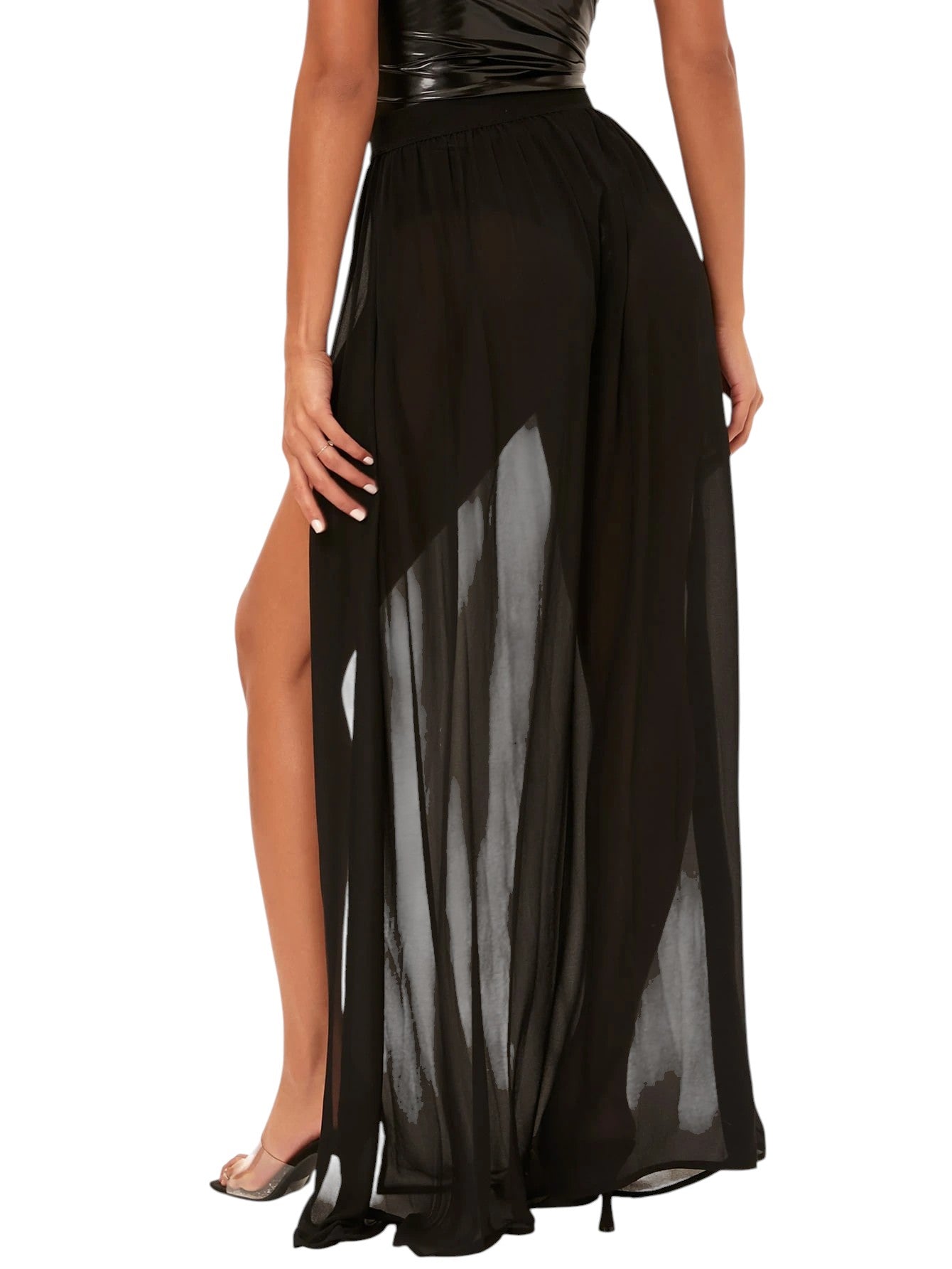 Címke nélküli, fekete, áttetsző, magas derekú, oldalt felvágott maxi szoknya
