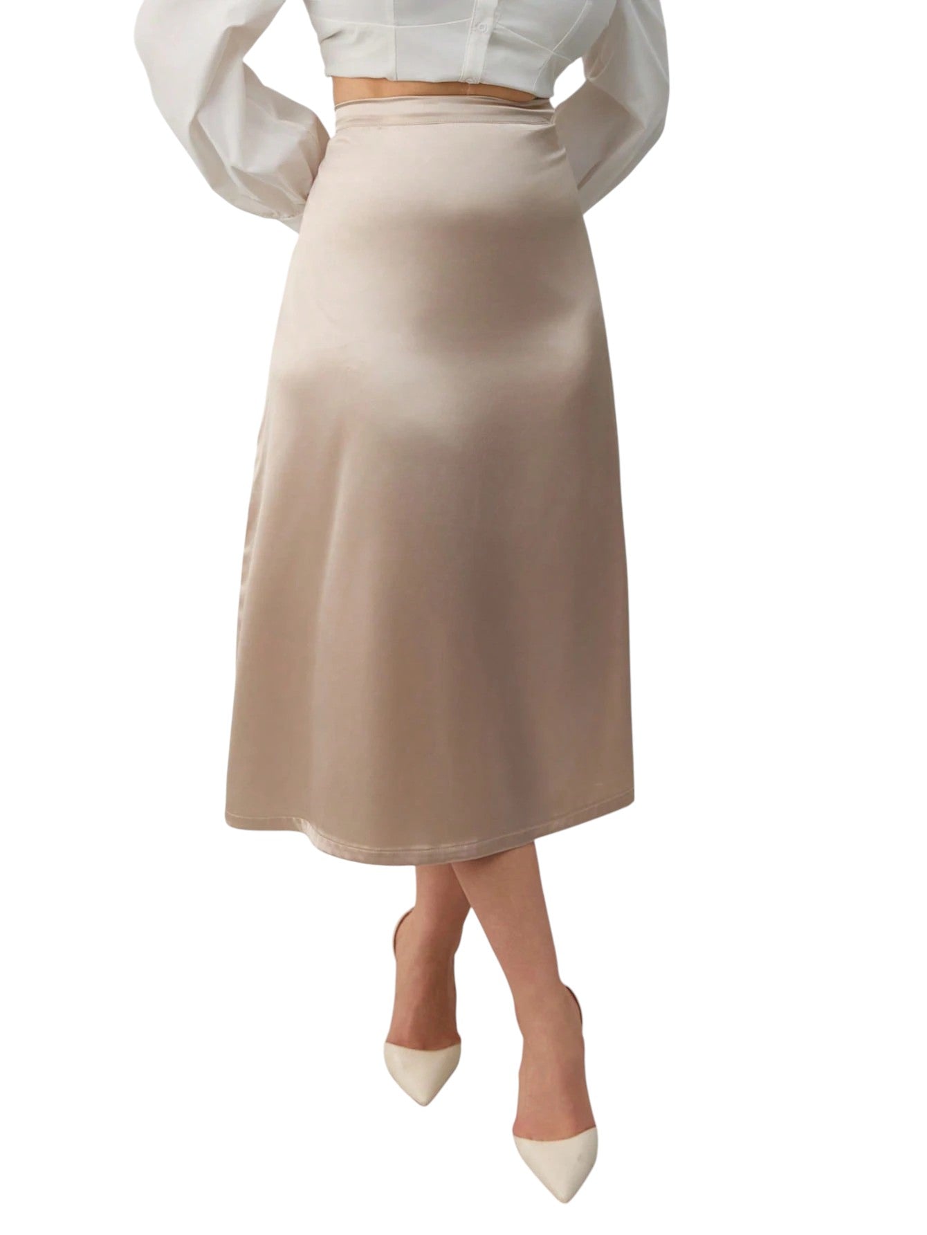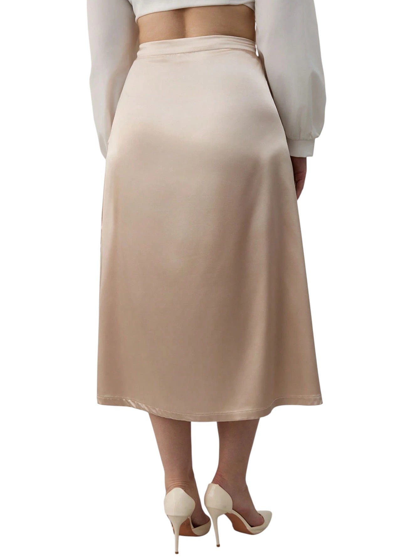 Címke nélküli, bézs, magas derekú, A-vonalú szatén midi szoknya