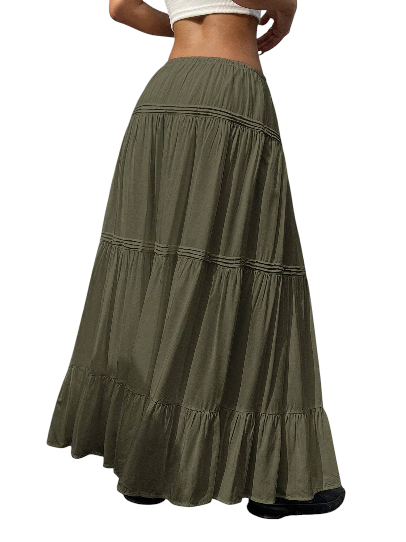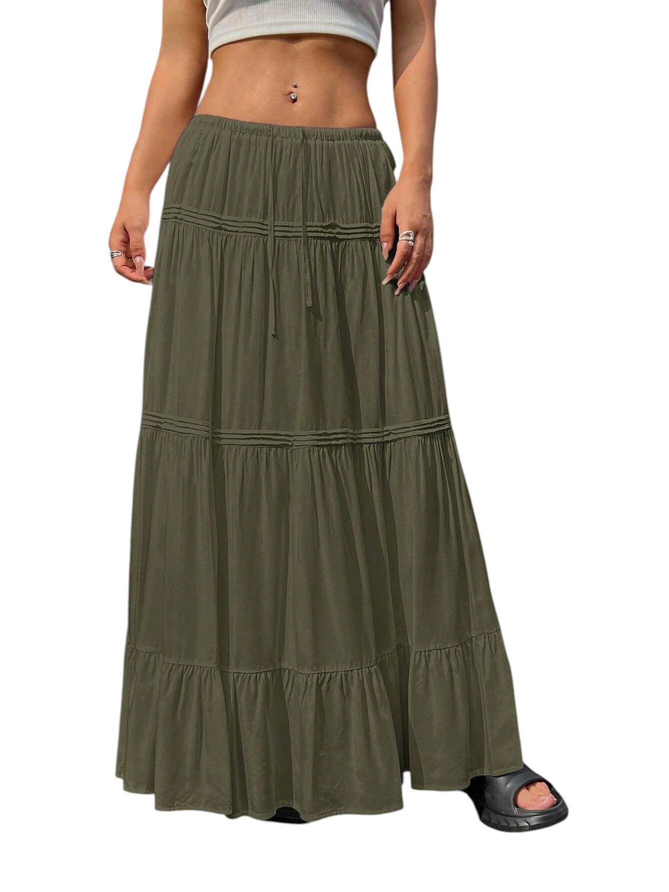 Címke nélküli, olívazöld, magas derekú, húzózsinóros, többszintes maxi szoknya
