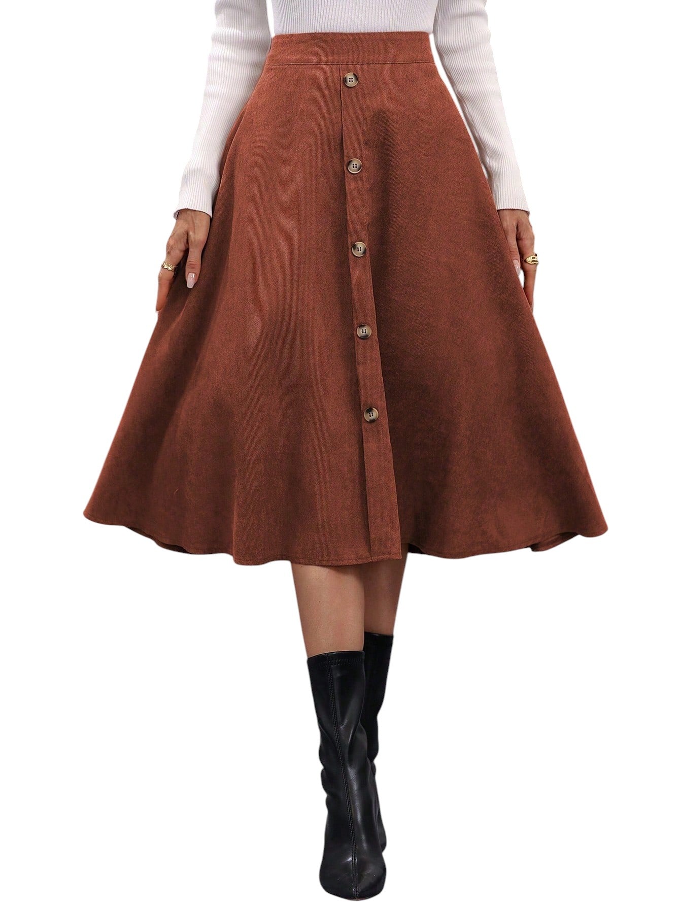 Címke nélküli, barna, magas derekú, elöl gombos, A-vonalú midi szoknya