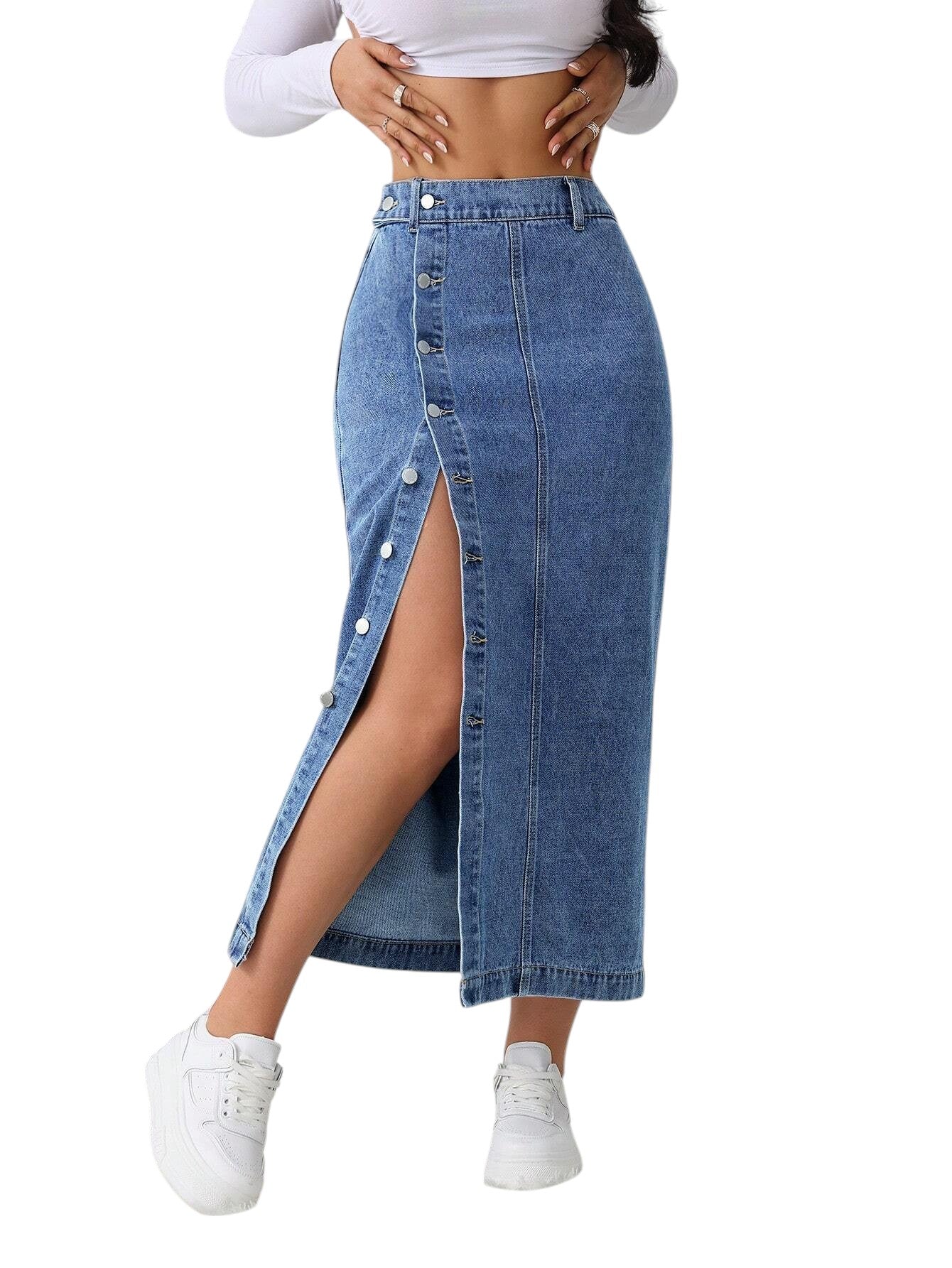 Címke nélküli, kék, magas derekú, elöl gombos farmer szoknya combközépig érő slicceléssel