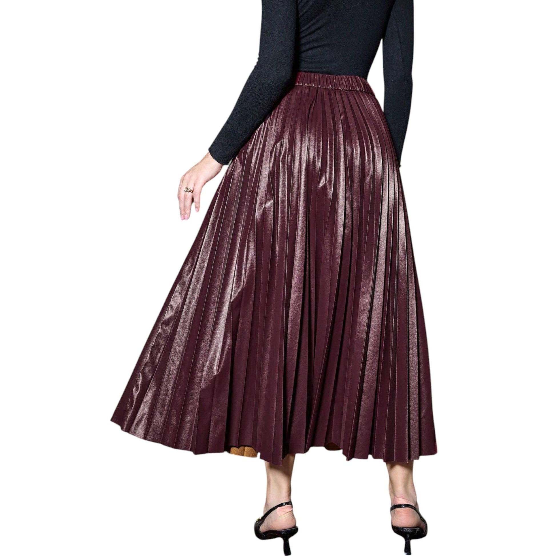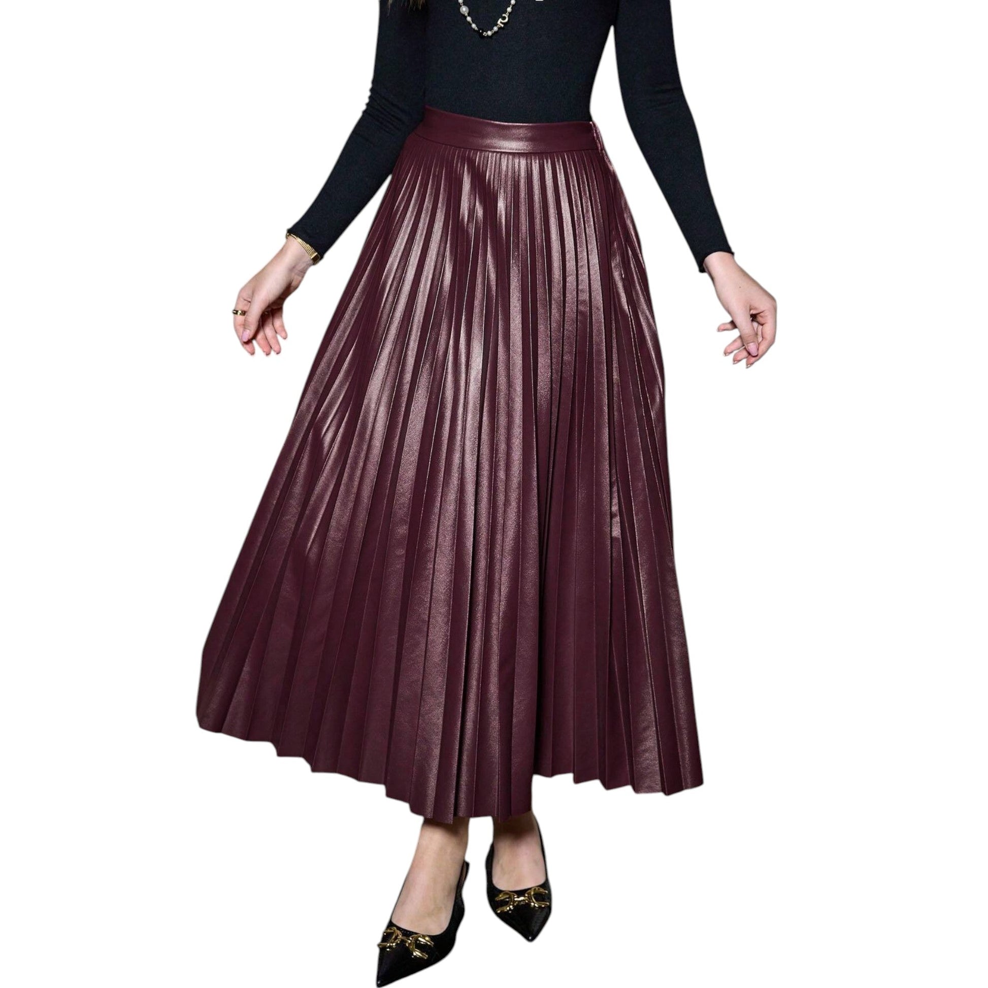 Címke nélküli, bordó, műbőr, pliszírozott midi szoknya.