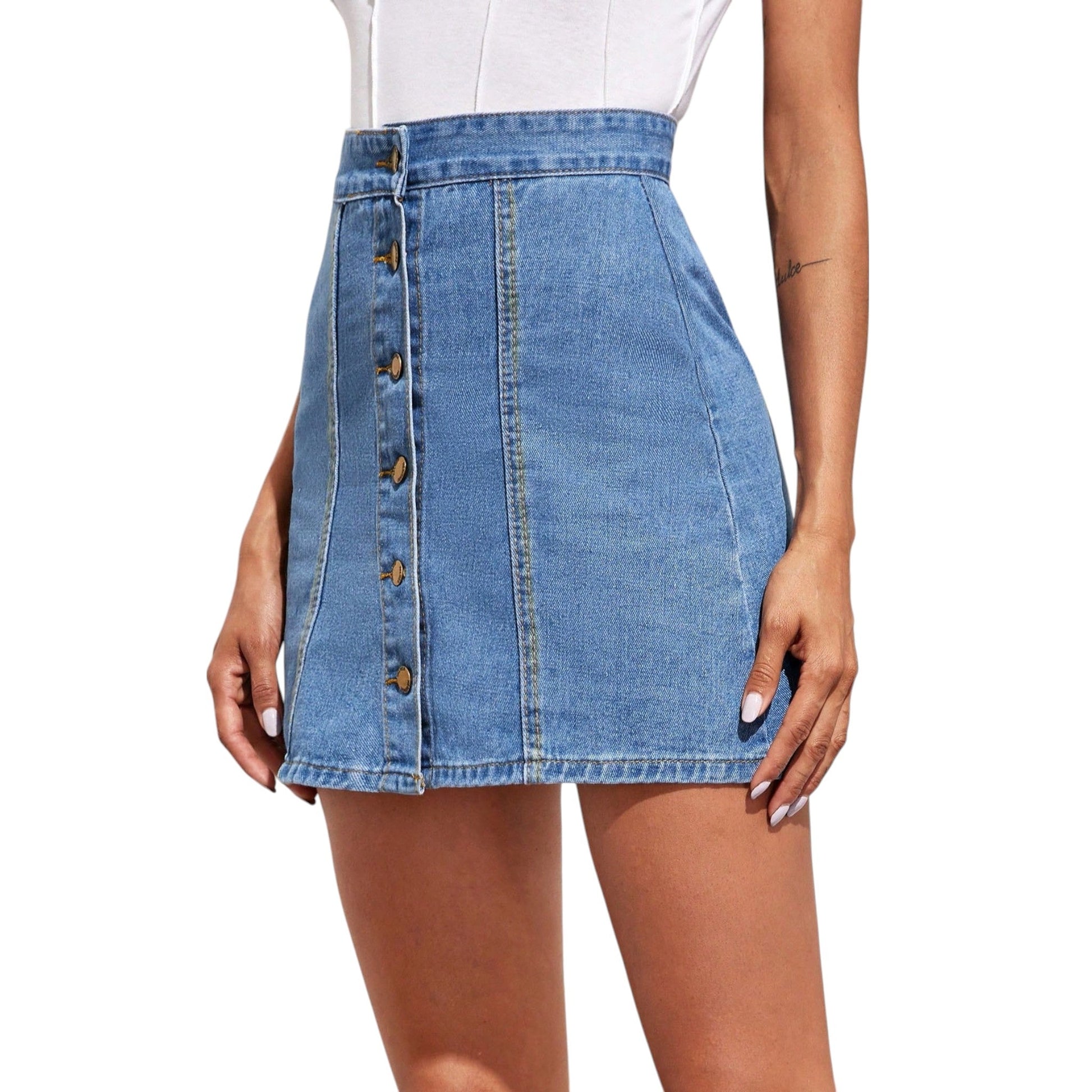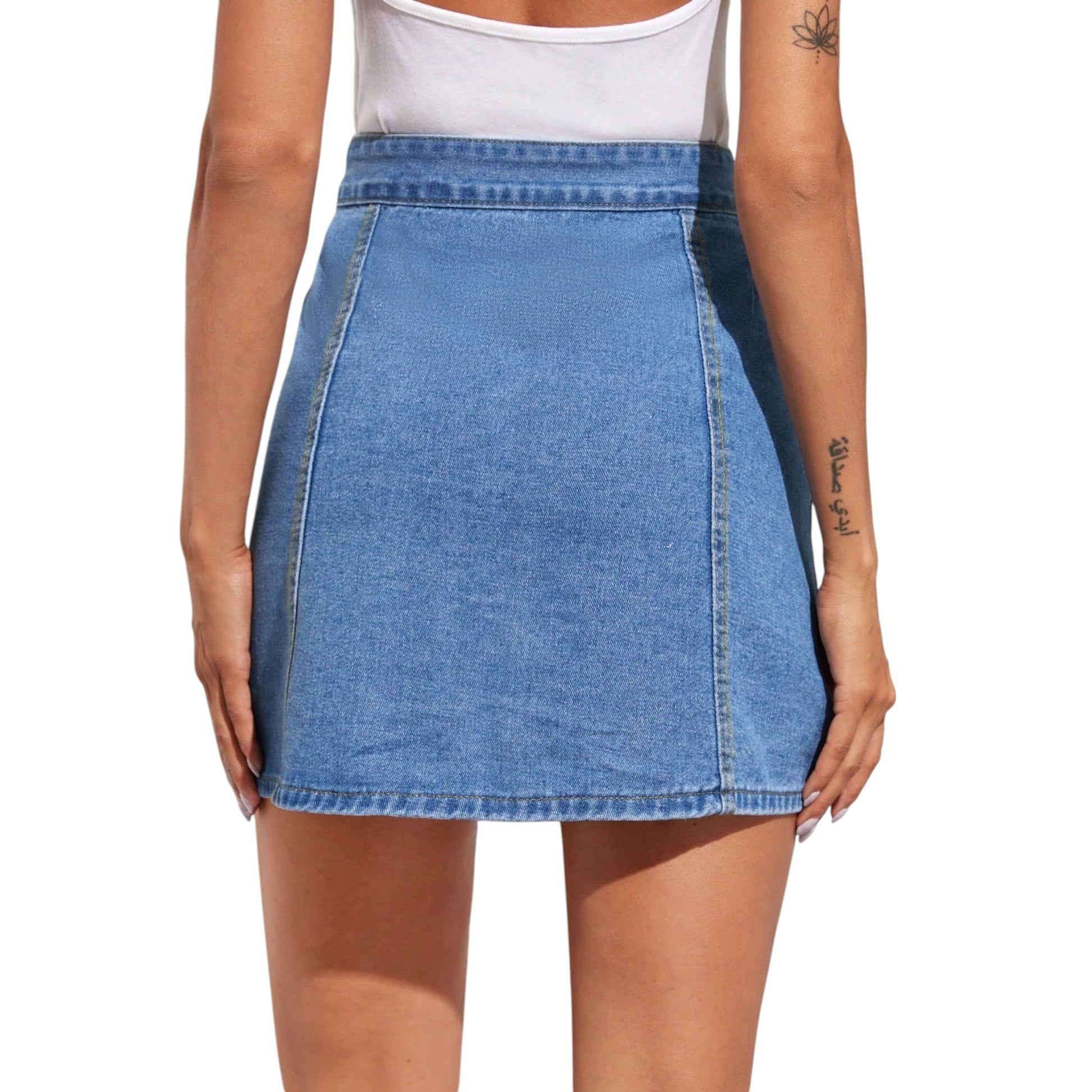 Címke nélküli, kék színű, A-vonalú farmer szoknya, gombos záródással.