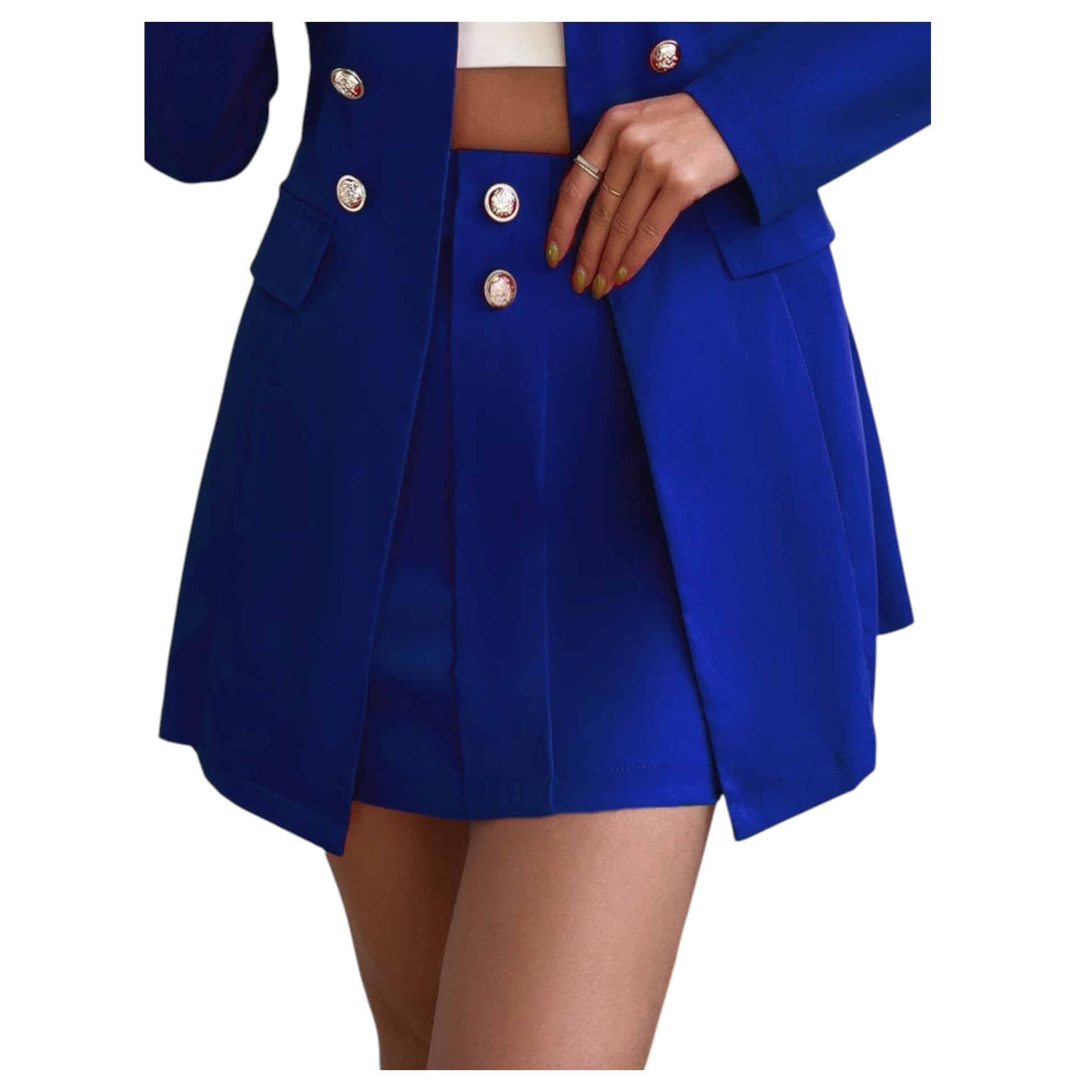 Címke nélküli, kék, magas derekú, rakott szoknya, elől arany színű díszgombokkal.