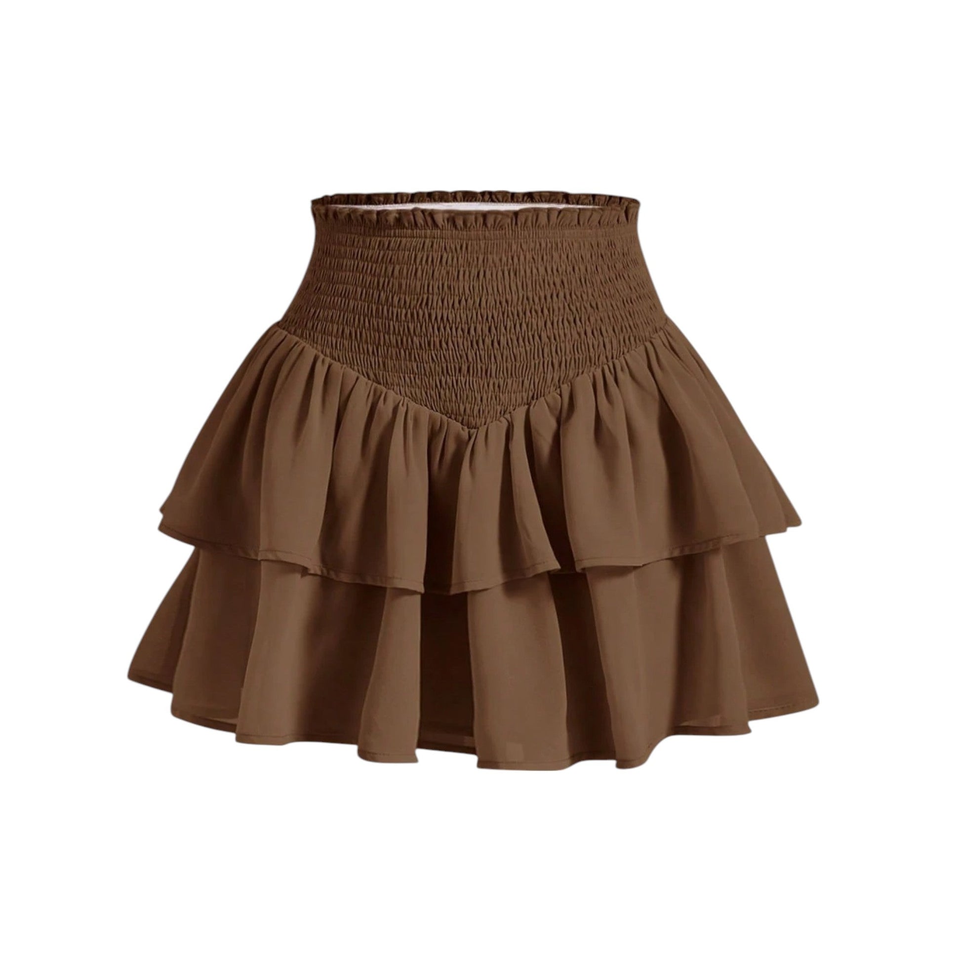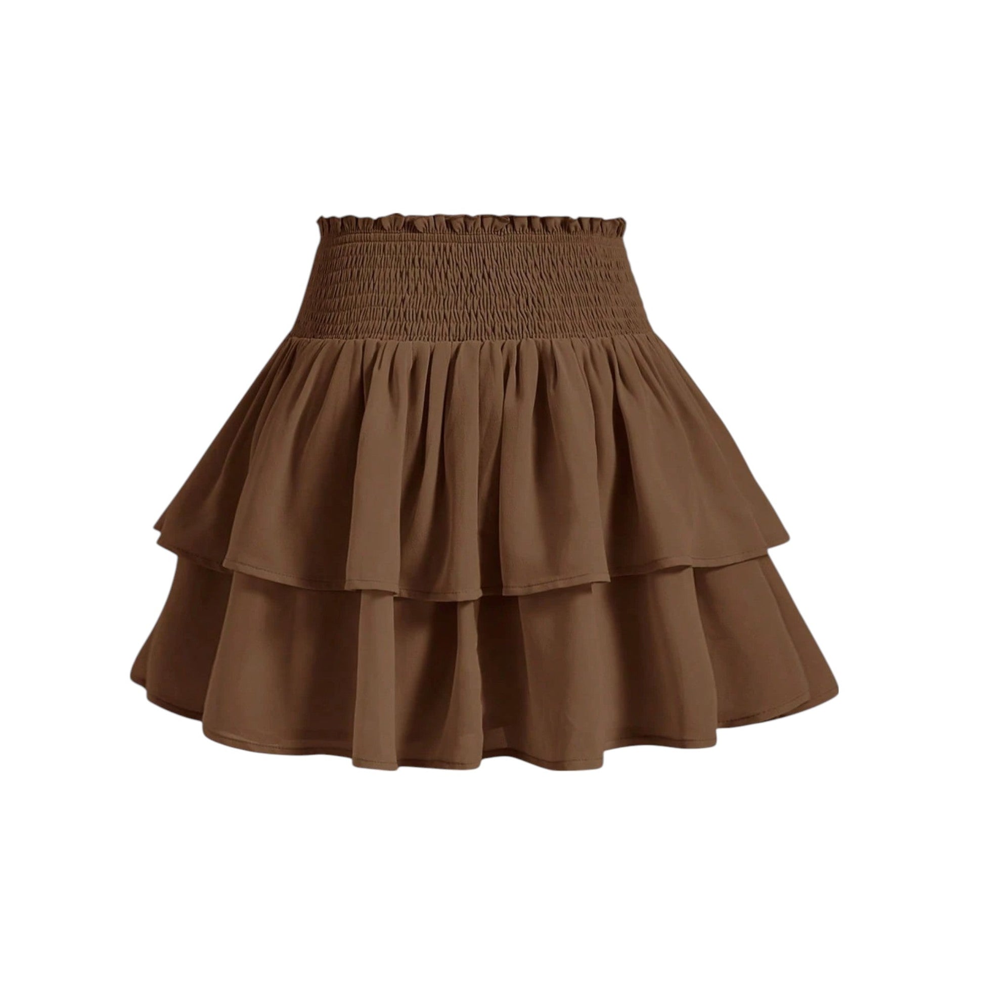 Címke nélküli, barna, magas derekú, ráncolt derékrészű, kétrétegű fodros mini szoknya.