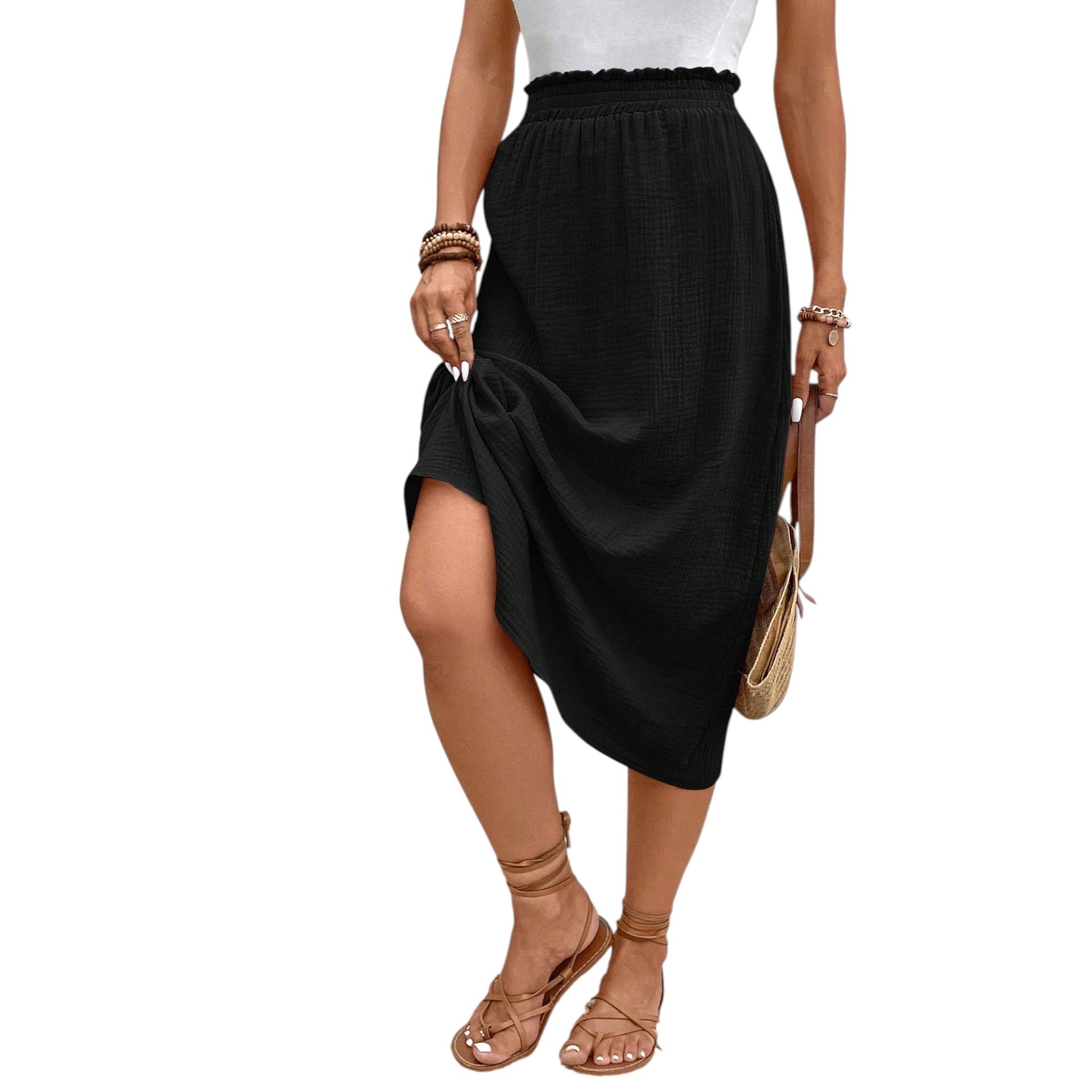 Címke nélküli, fekete, rugalmas papírtasak derékú, ráncolt, aszimmetrikus sliccelt szegélyű, midi hosszúságú.