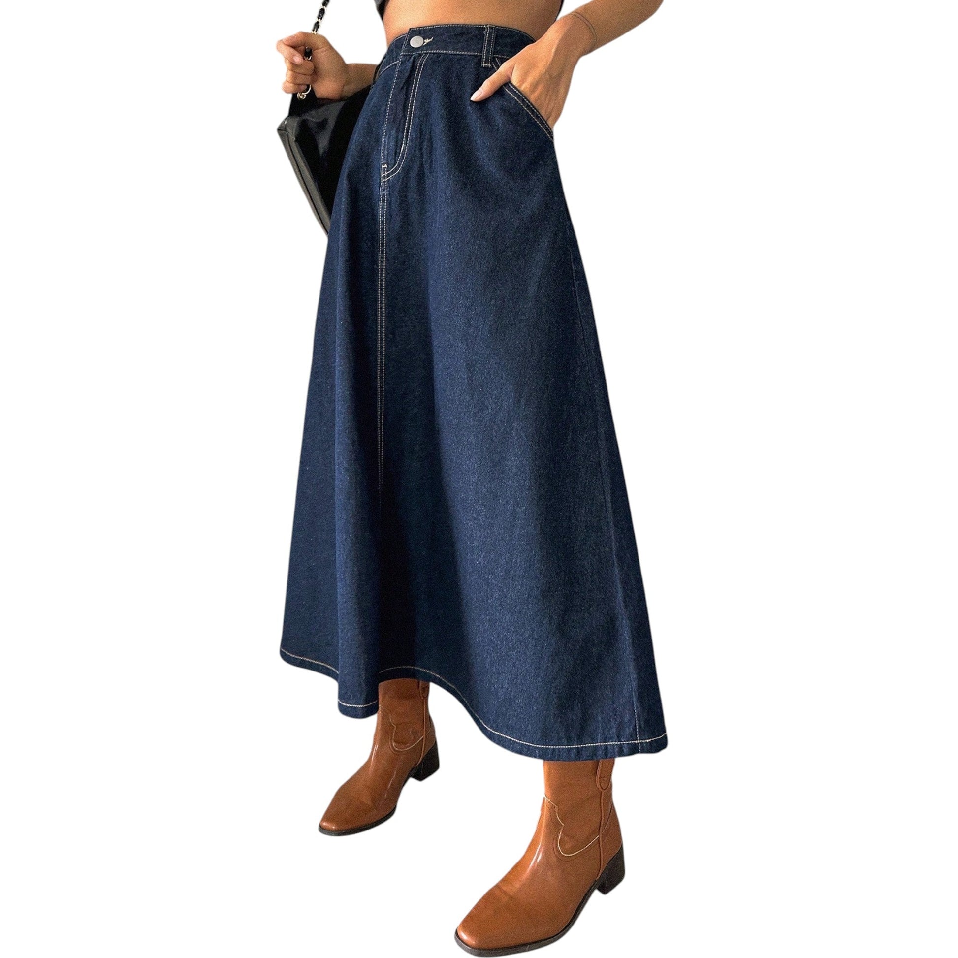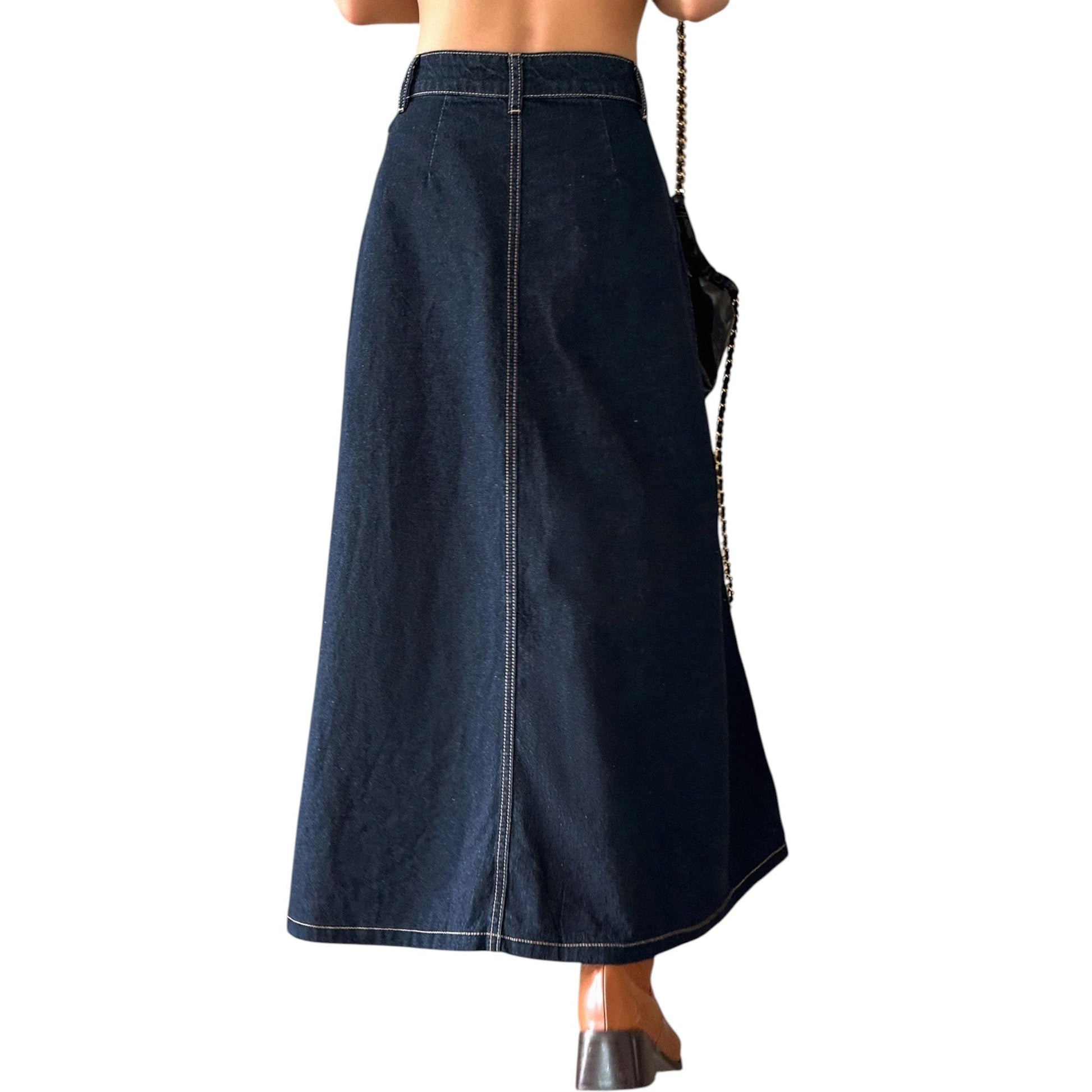 Címke nélküli, sötétkék, A-vonalú, midi hosszúságú farmer szoknya, kontrasztos varrással, magas derekú, elöl zsebekkel.