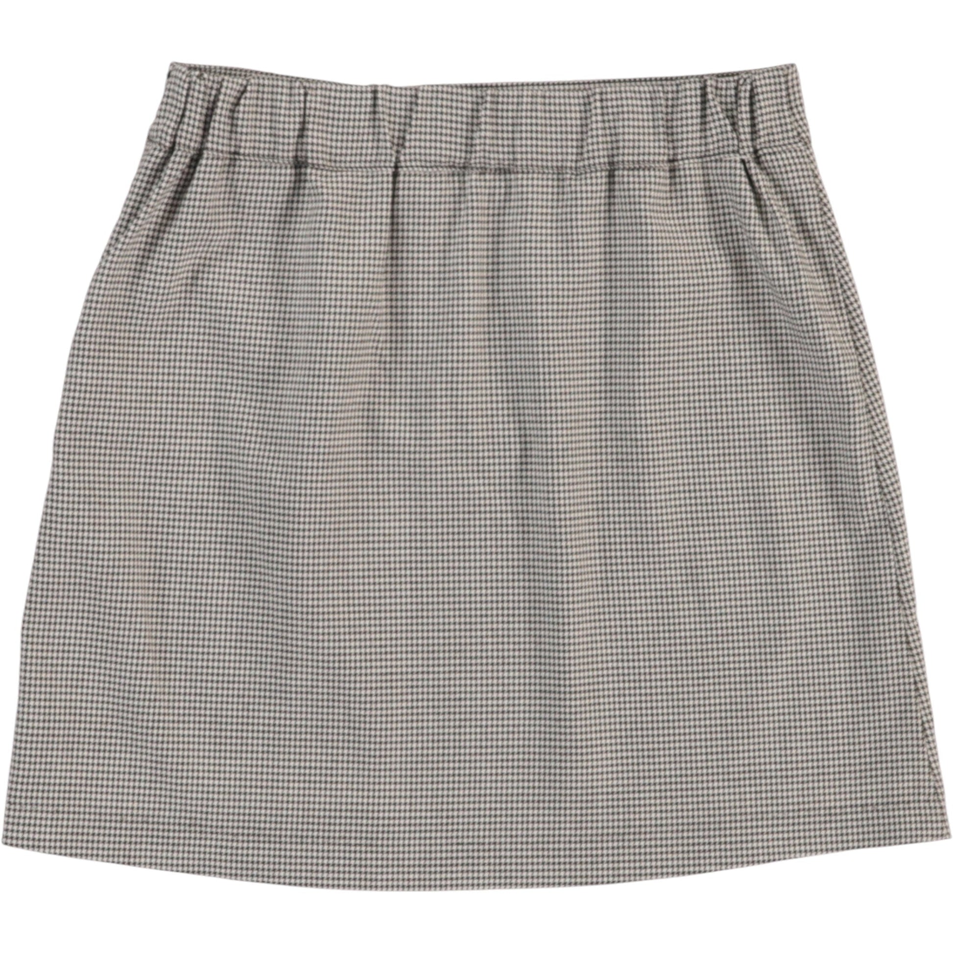 Címke nélküli, szürke, rövid, magasított derekú, A-vonalú, apró fekete kockás mintával, elején átlapolt hatás, oldalán 4 gombos díszítés.