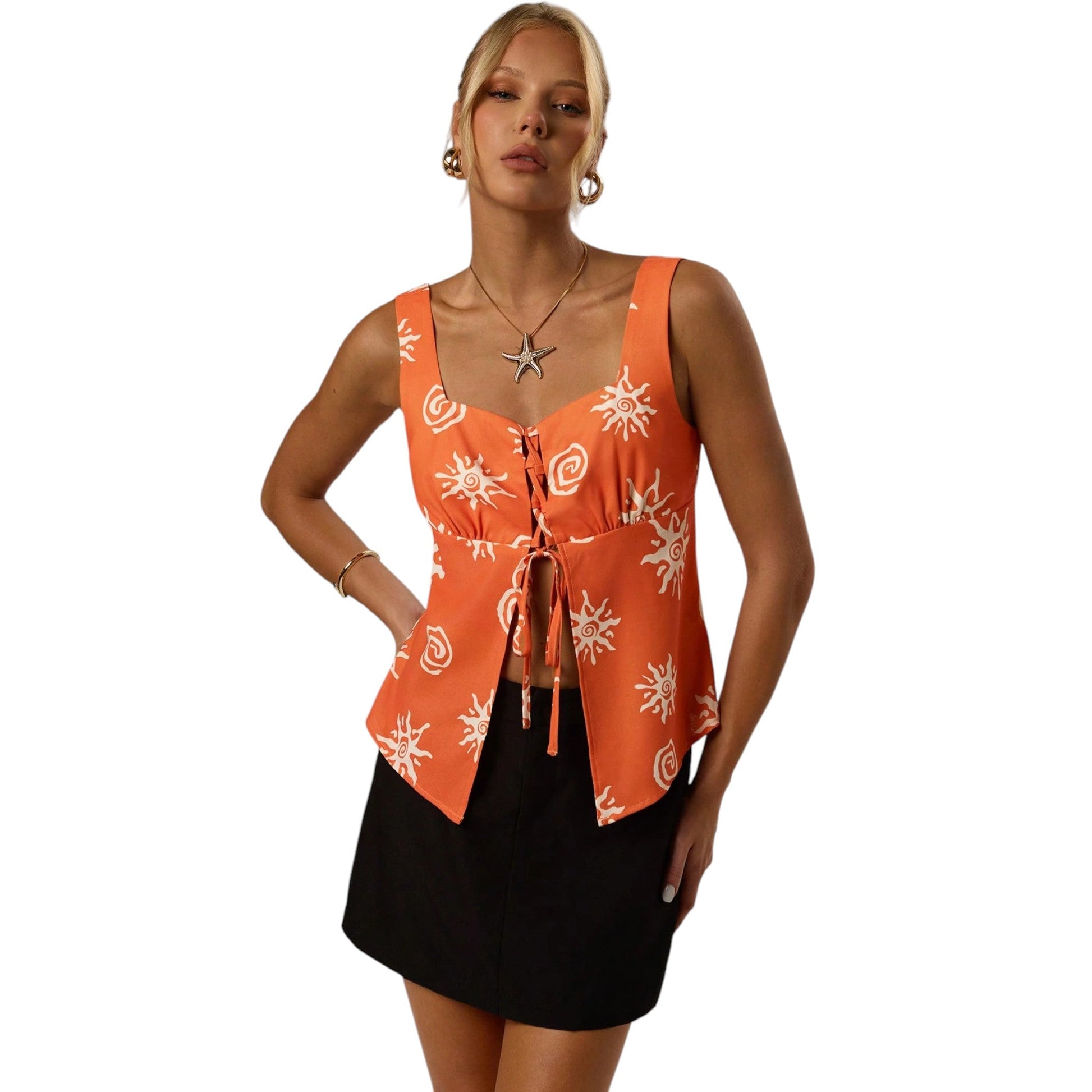 Címke nélküli, narancssárga alapon fehér nap mintás, ujjatlan, fűzős, V-nyakú top.