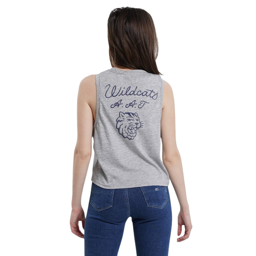 Címke nélküli, szürke melírozott, pamutdzsörzé, ujjatlan crop top trikó, kerek nyakkivágás, "SHINJUKU WILDCATS" és Superdry logó.