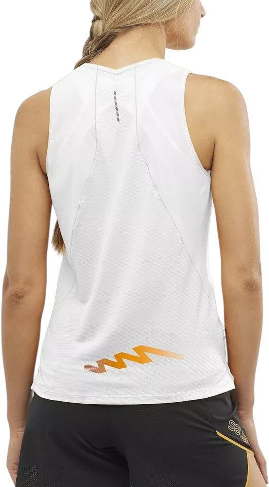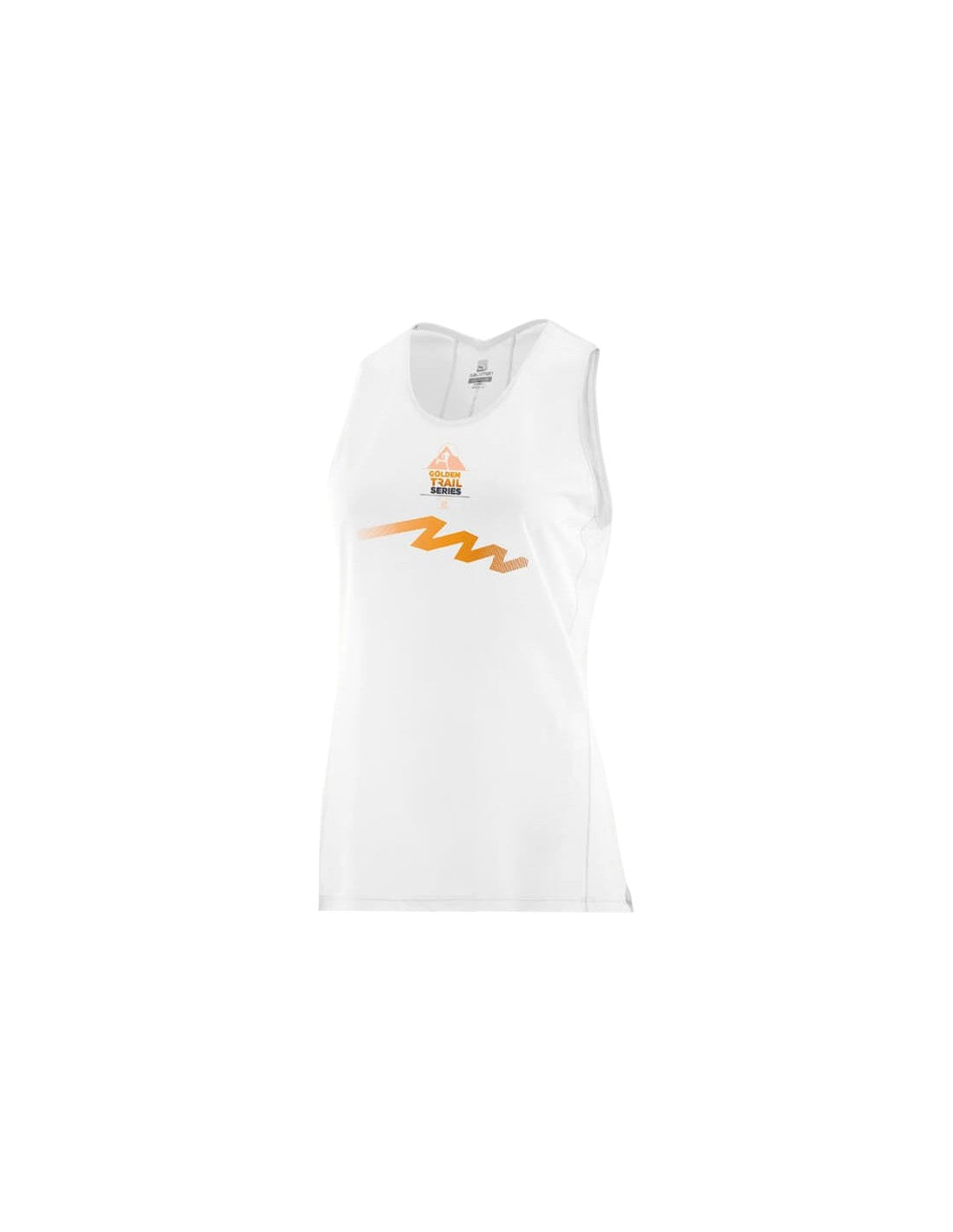 Címke nélküli, fehér, technikai sportanyag, testhezálló ujjatlan sport trikó, kerek nyakkivágás, "Salomon Trail Series" és grafika.