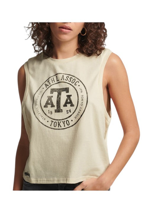 Címke nélküli, krém, pamutdzsörzé, ujjatlan crop top trikó, kerek nyakkivágás, "ATHL. ASSOC. ATA TOKYO LEAGUE" kör alakú grafika.