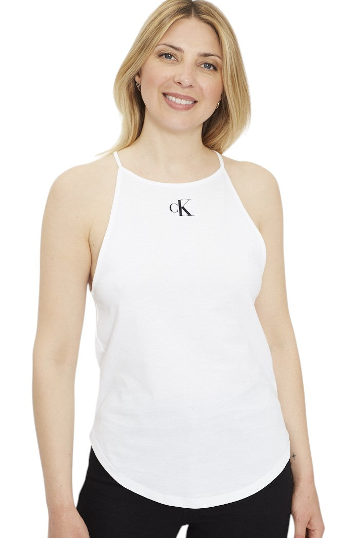 Címke nélküli, fehér, pamut, testhezálló fazon, halter nyakkivágás, ujjatlan, hímzett logó, ívelt alsó szegély.