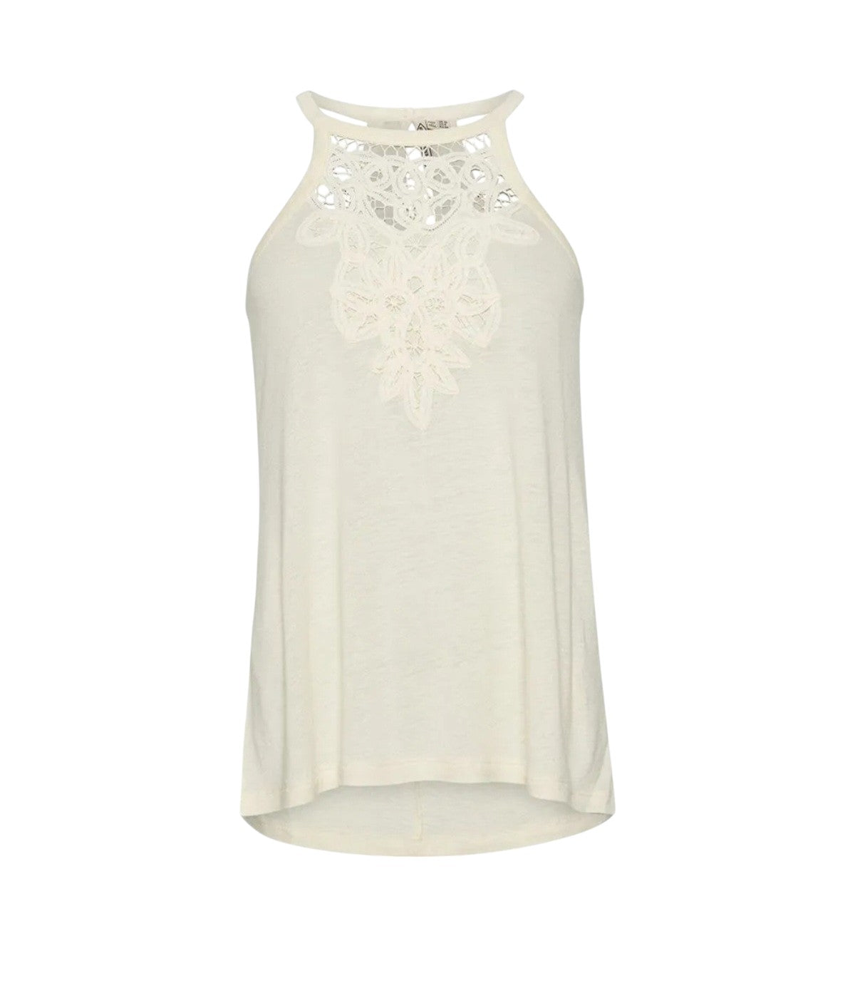 Címke nélküli, krém/törtfehér, pamut/viszkóz, laza fazon, halter nyak (csipkés), ujjatlan, csipke rátét a nyakrészen.