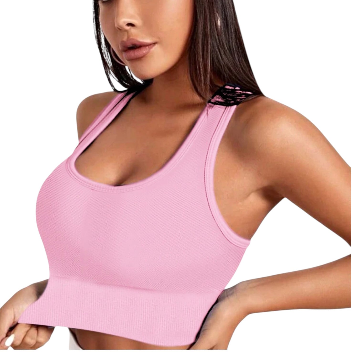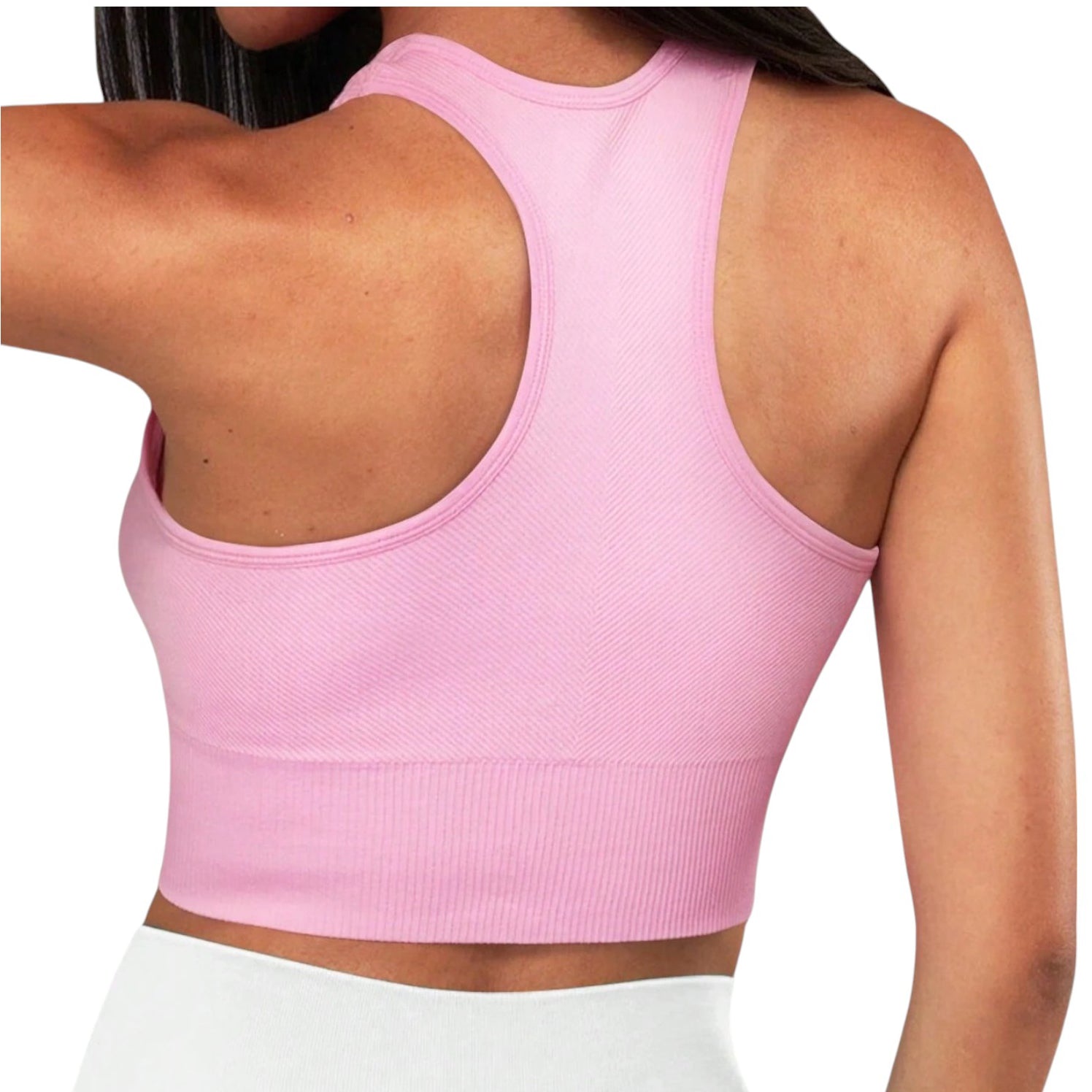 Címke nélküli, rózsaszín színű, bordázott, széles pántú sportmelltartó.