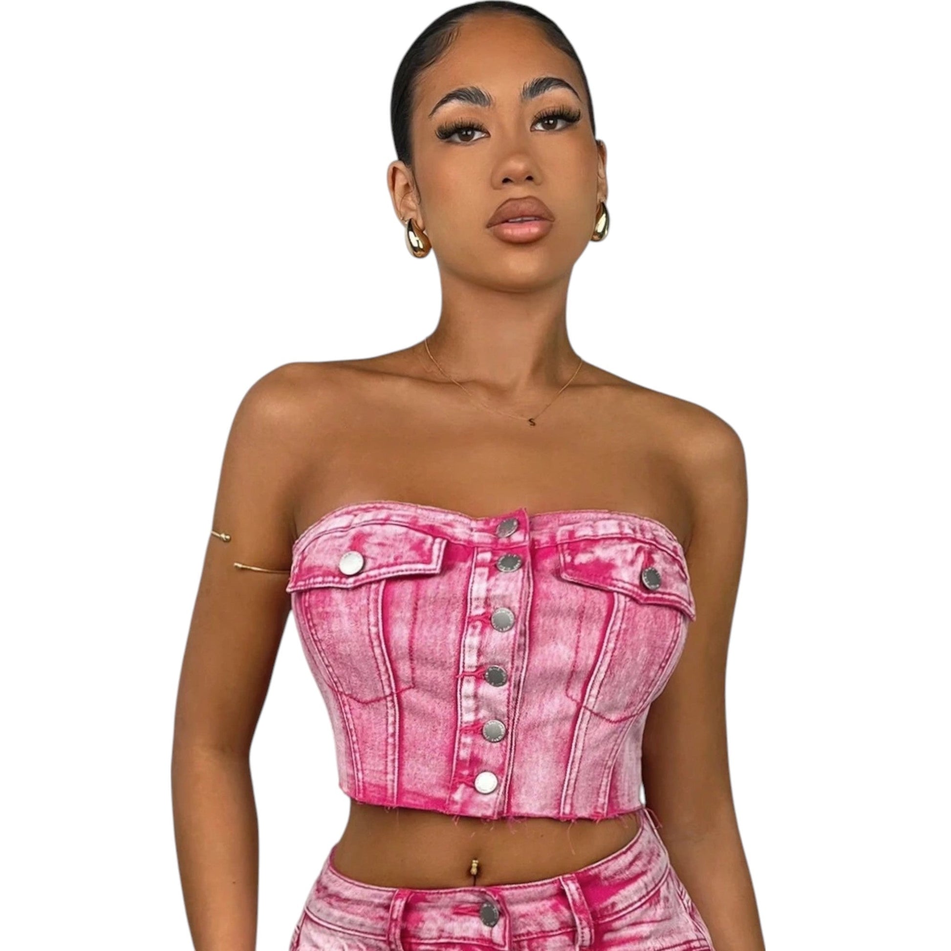 Címke nélküli, rózsaszín, pánt nélküli, gombos, farmer crop top, elöl zsebekkel.
