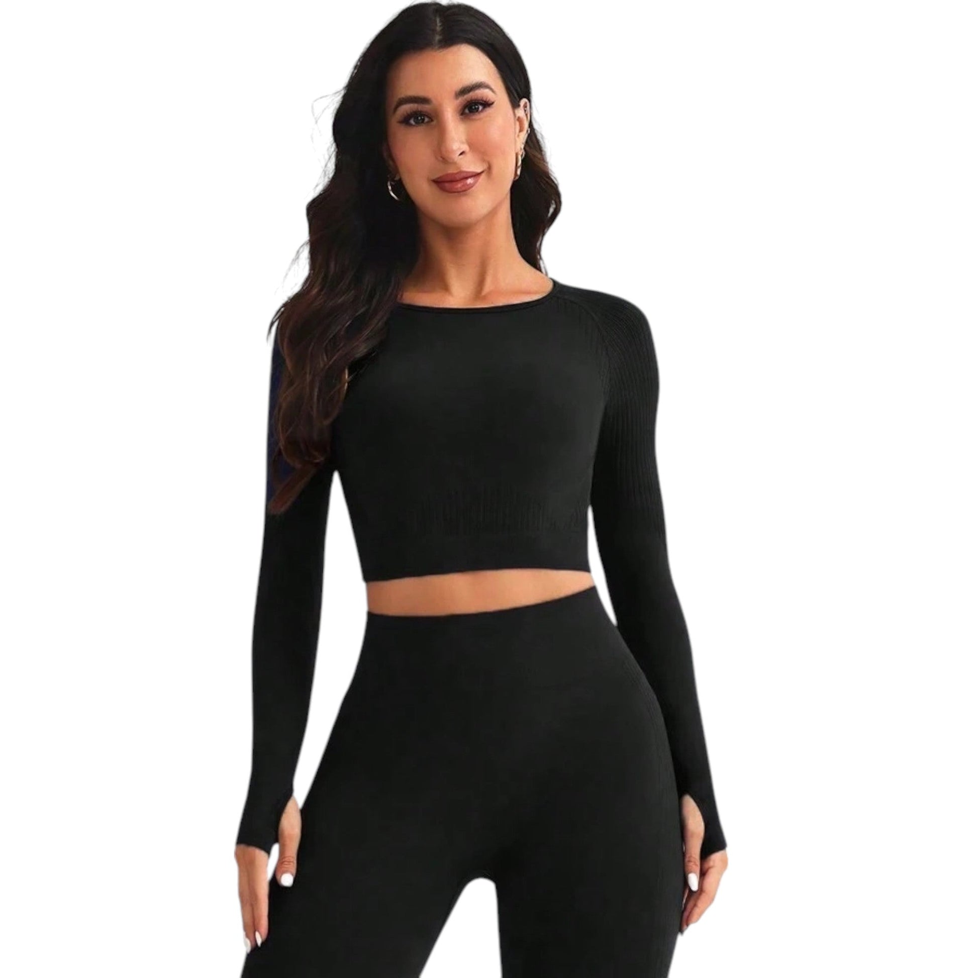 Címke nélküli, fekete színű hosszú ujjú crop top. Kerek nyakkivágású.