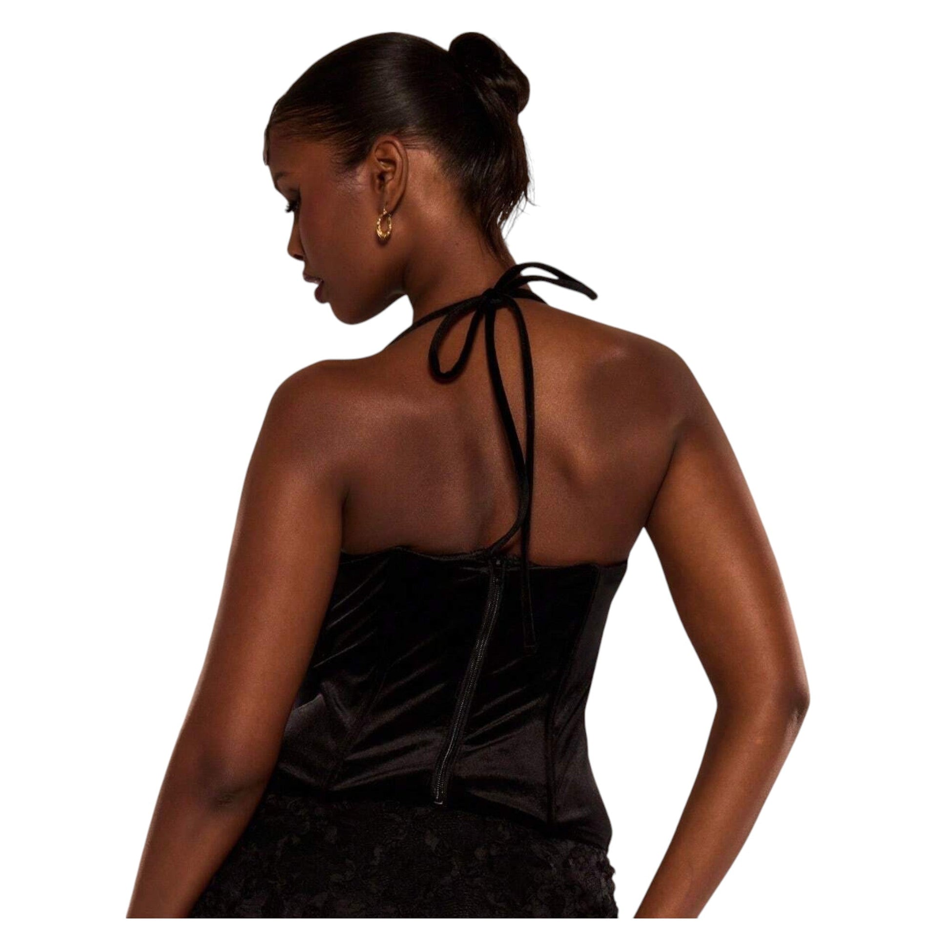 Címke nélküli, fekete, halter nyakú, bársony fűző.