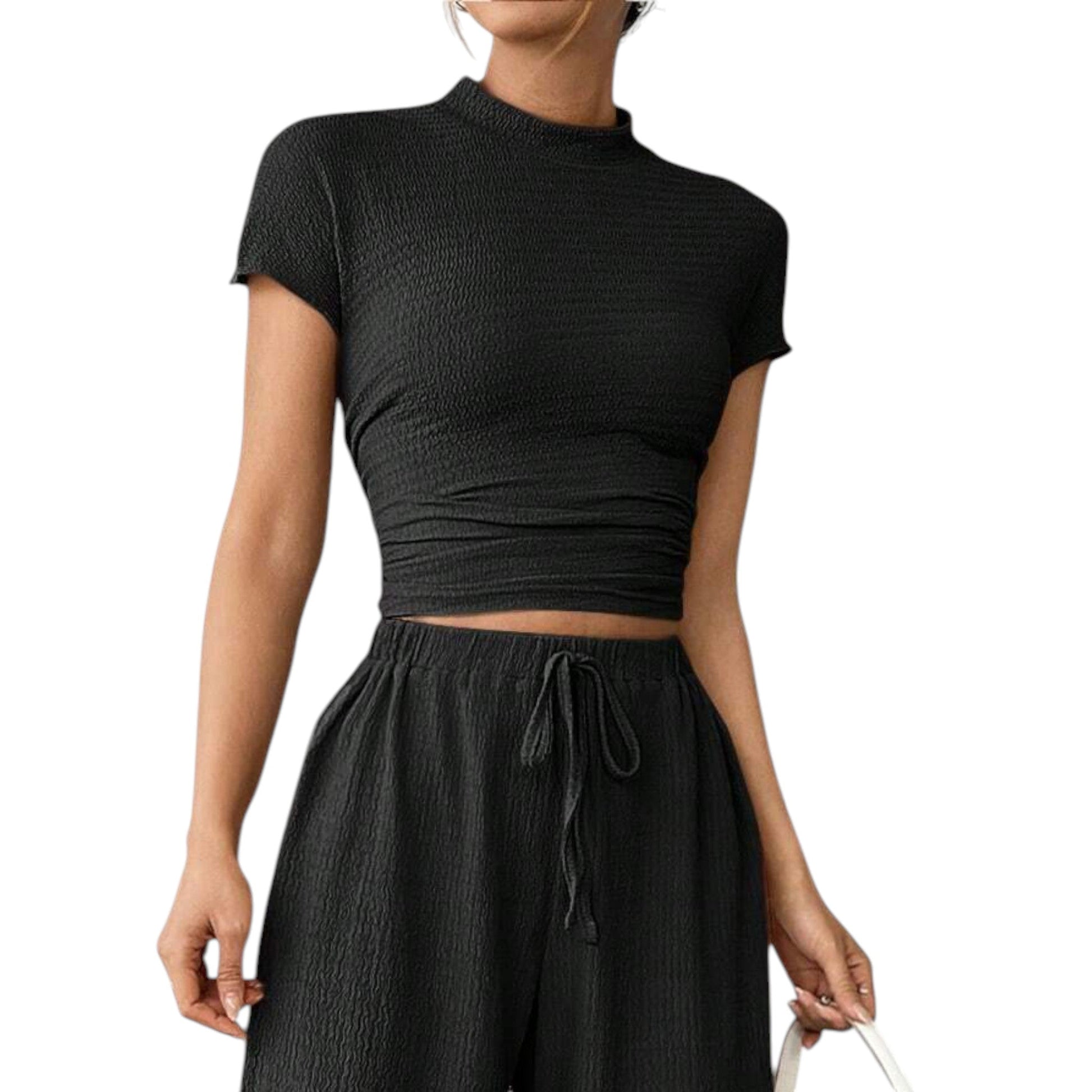 Címke nélküli, fekete, magas nyakú, rövid ujjú, ráncolt crop top.