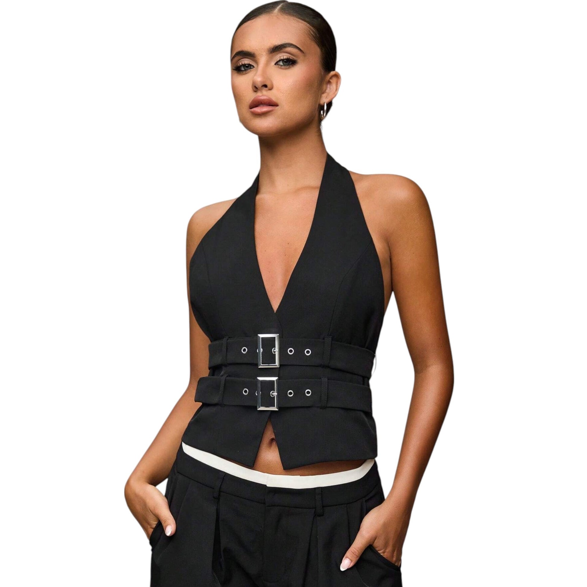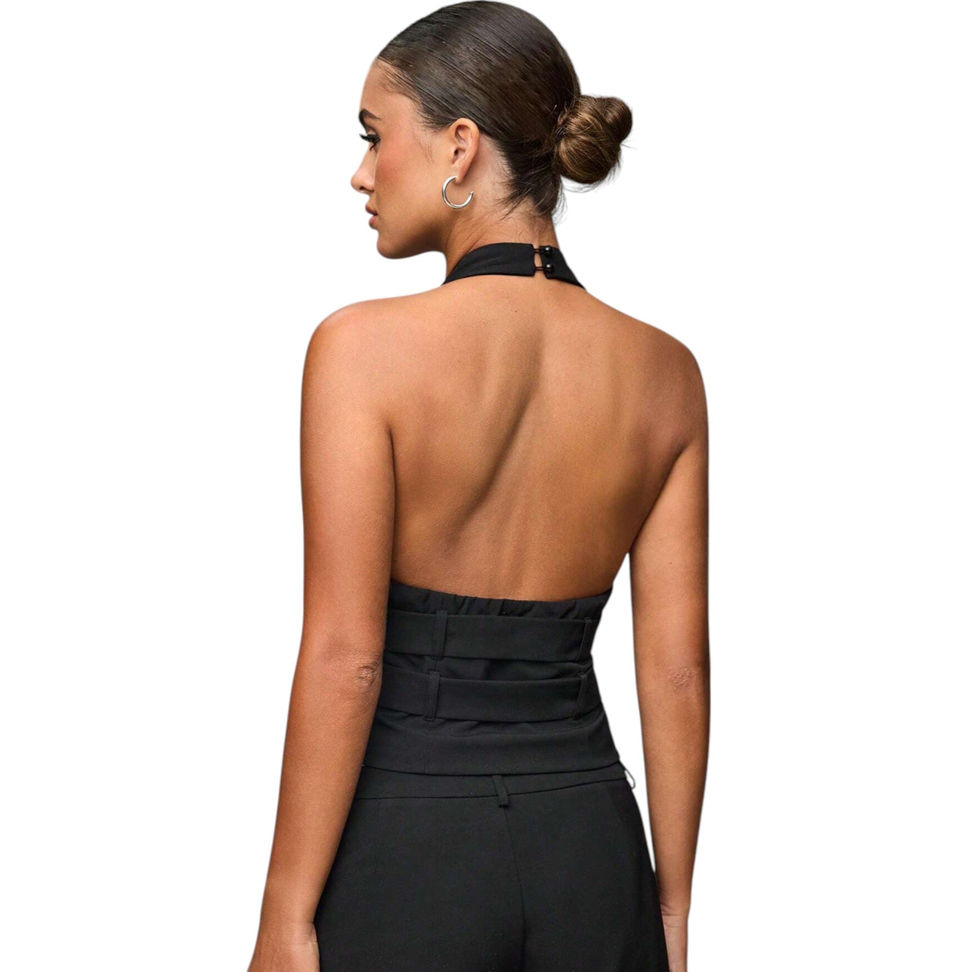 Címke nélküli, fekete, mélyen dekoltált, félmeztelen fazonú mellény, állítható csatokkal a derékrészen.