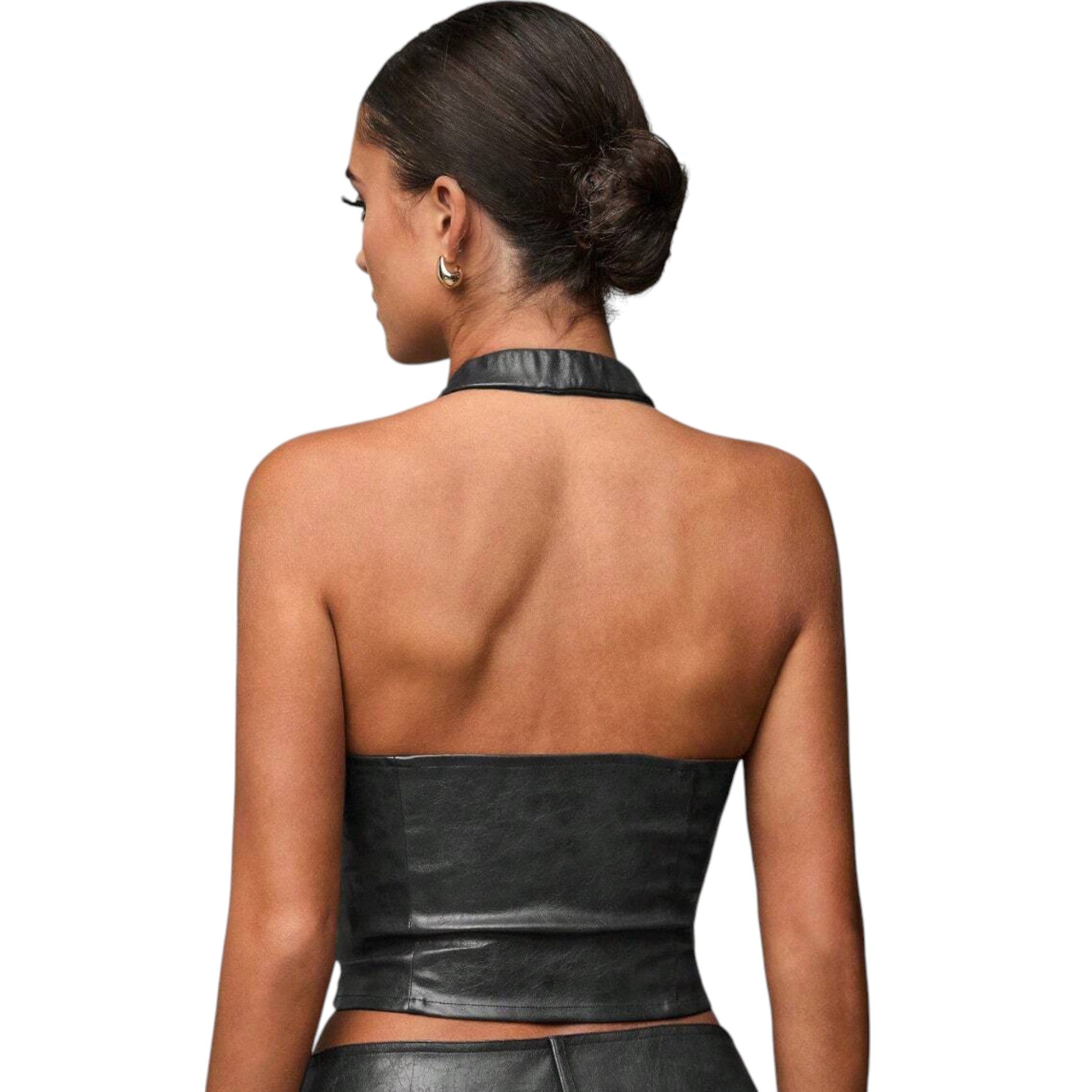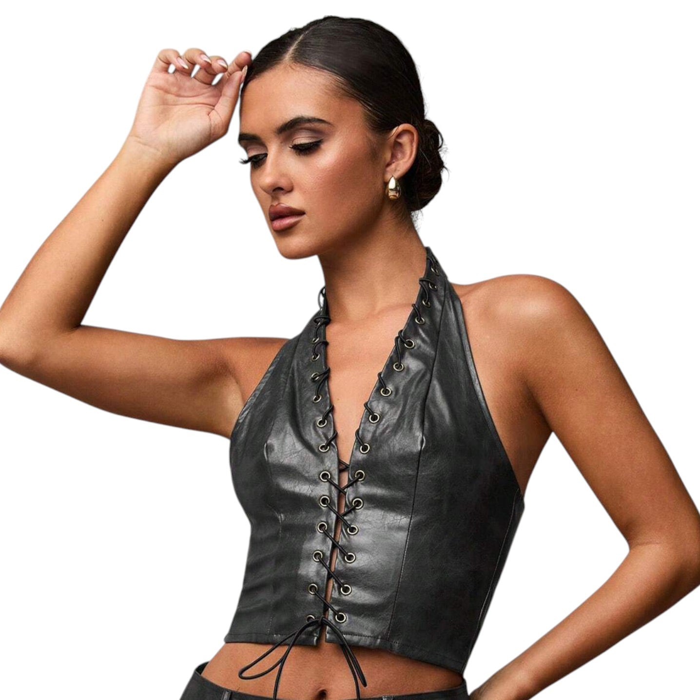 Címke nélküli, fekete, műbőr hatású, fűzős elülső részű, mély V-nyakú, ujjatlan crop top.