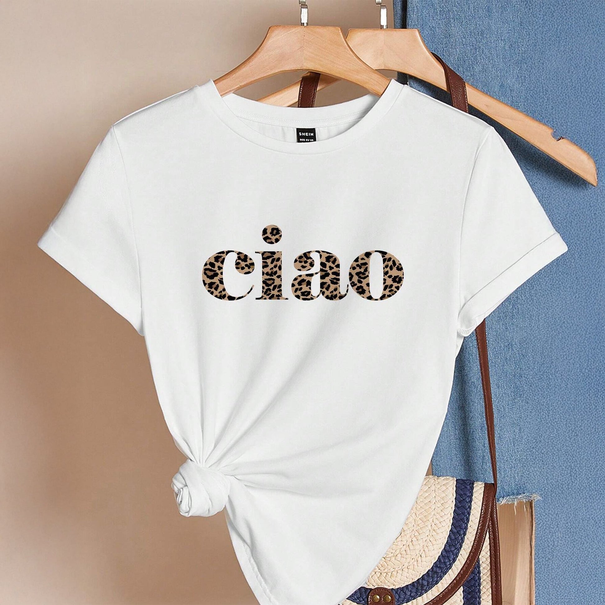 Címke nélküli, fehér, rövid ujjú, kerek nyakú, elején „ciao” felirattal, ami leopárdmintás.