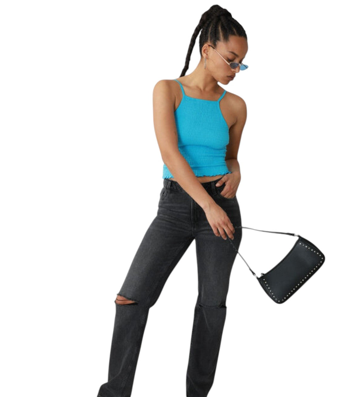Címke nélküli, türkizkék, bordázott anyag, testhezálló ujjatlan crop top, egyenes nyakkivágás vékony pántokkal, fodros alsó szegély.