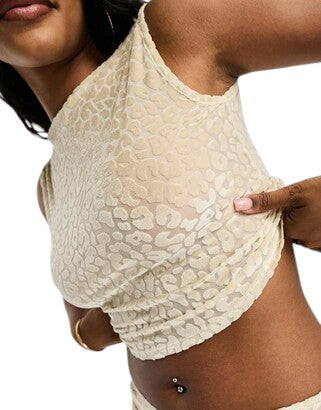 Címke nélküli, krém alapon tónusos párducminta, áttetsző, texturált anyag (velúr hatású minta), testhezálló ujjatlan crop top, magas nyak.